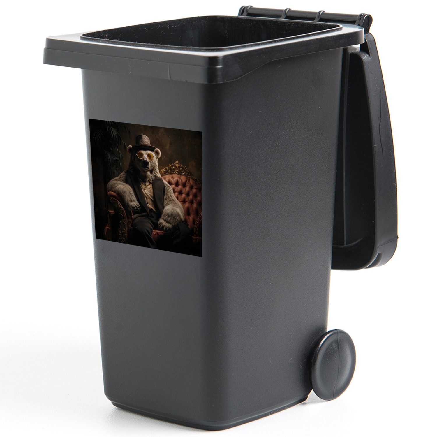 Ein Schimpanse sitzt in einem braunen Anzug, mit Hut und Sonnenbrille auf einem verzierten Stuhl vor einem reich verzierten Hintergrund.