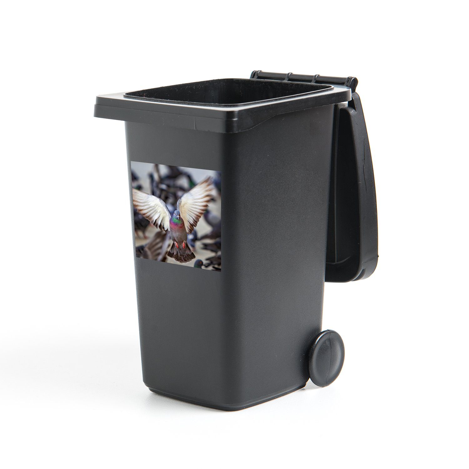 Eine Nahaufnahme einer wegfliegenden Taube. Viele weitere Tauben sind im Hintergrund vage zu erkennen. Der graue Vogel hat eine farbige Brust. Dieses Bild kommt im Wohnzimmer gut zur Geltung.