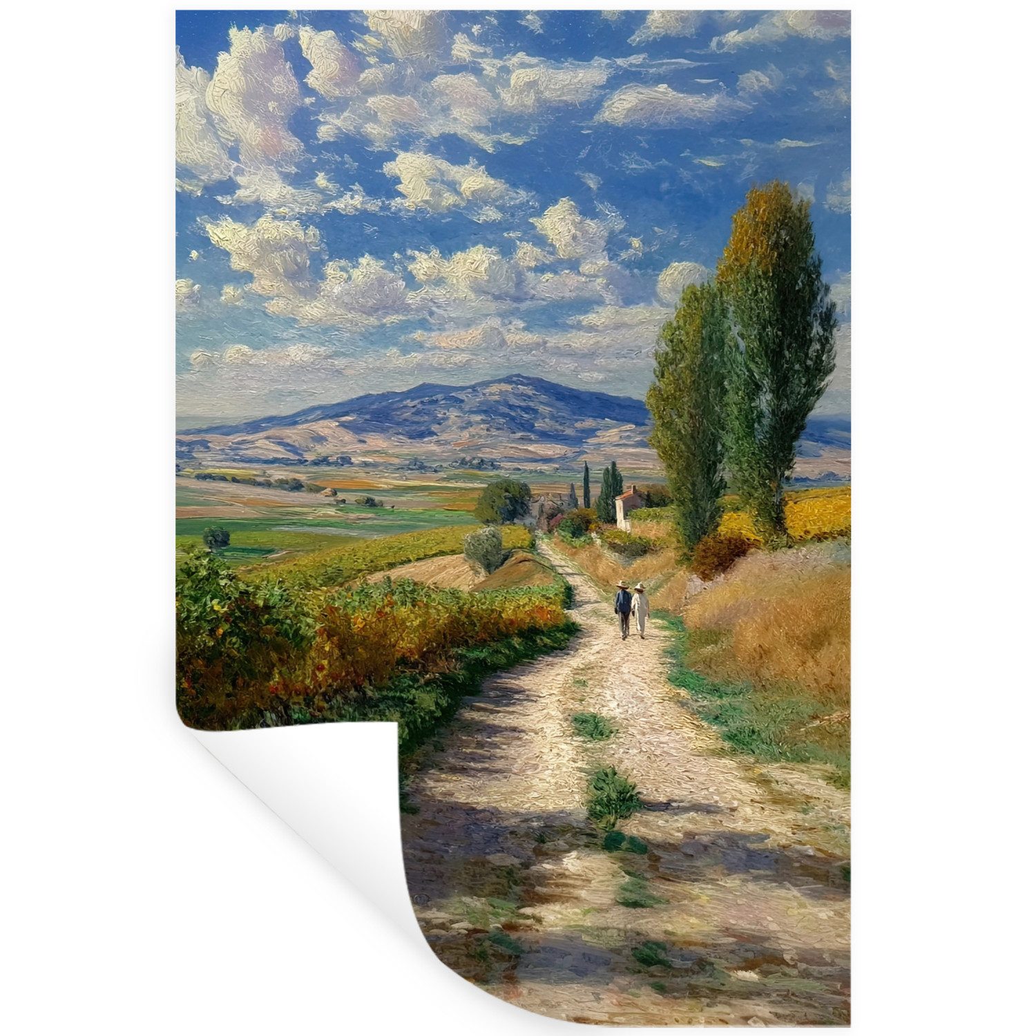 Zwei Gestalten gehen einen staubigen Weg zwischen Weinreben und Feldern entlang. Der Himmel ist klar mit Wolken über sanften Hügeln.