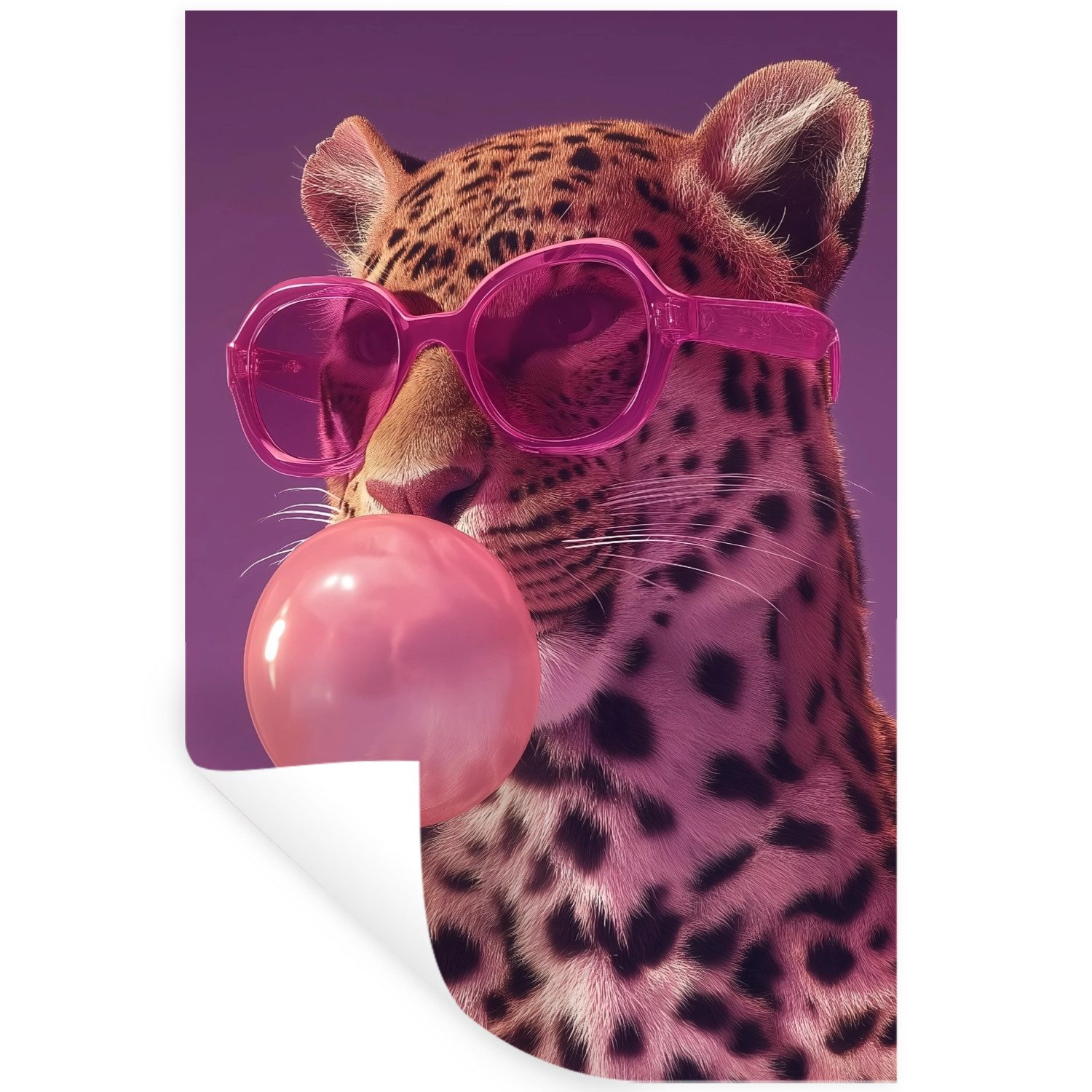 Ein Panther trägt eine rosafarbene Sonnenbrille und bläst eine rosafarbene Kaugummiblase vor einem lila-rosa Hintergrund, was einen verspielten und modischen Look ergibt.