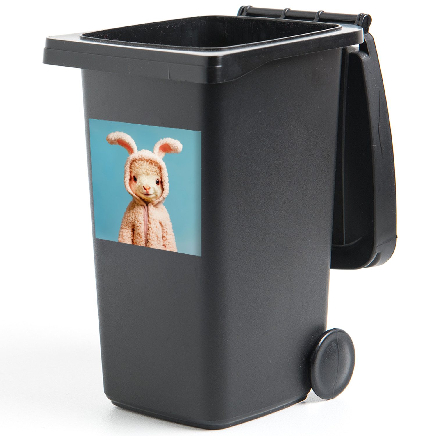 Ein süßes kleines Lamm trägt ein flauschiges rosa Osterhasen-Outfit mit langen Ohren. Das Tier blickt freundlich in die Kamera vor einem hellblauen Hintergrund, der eine fröhliche und verspielte Atmosphäre schafft.