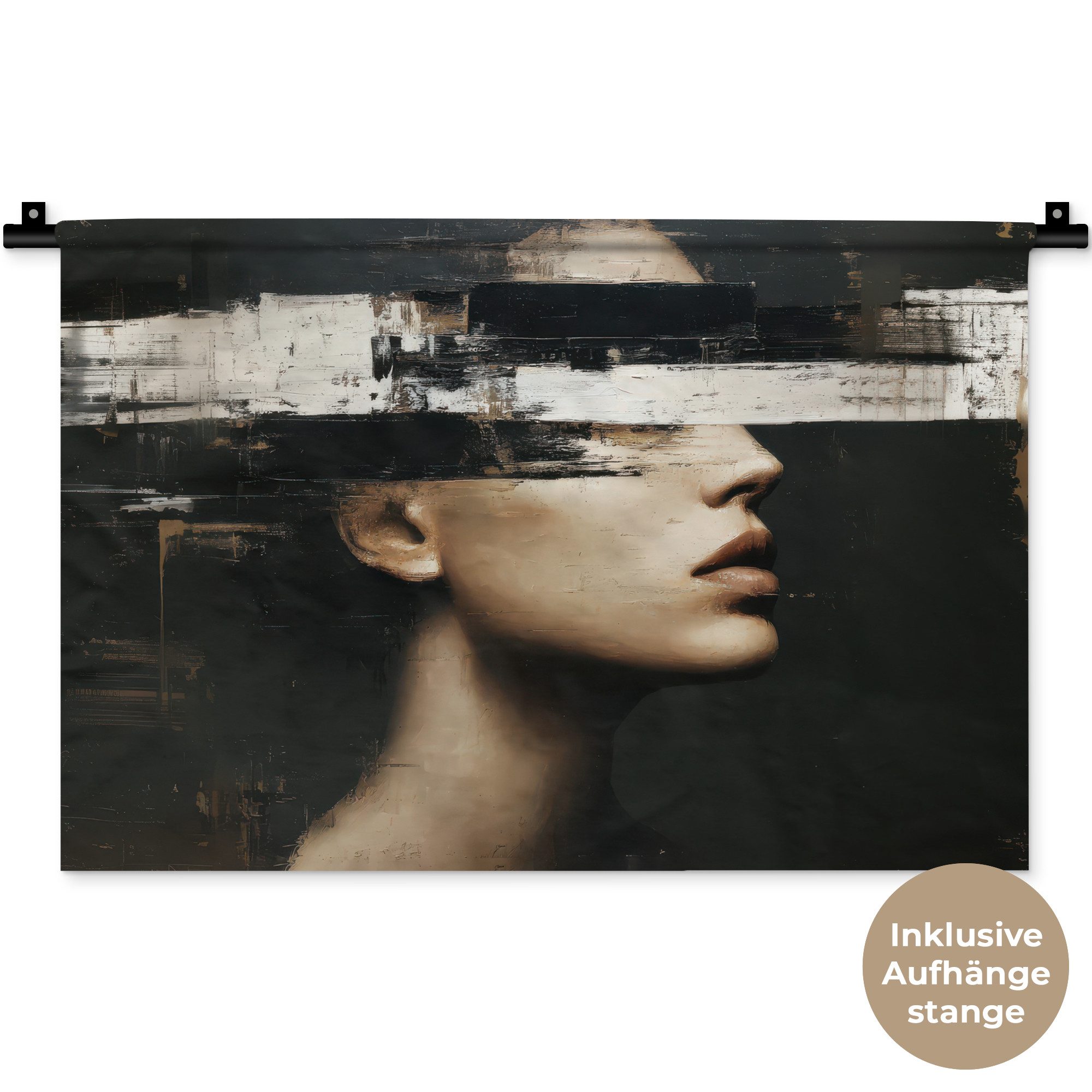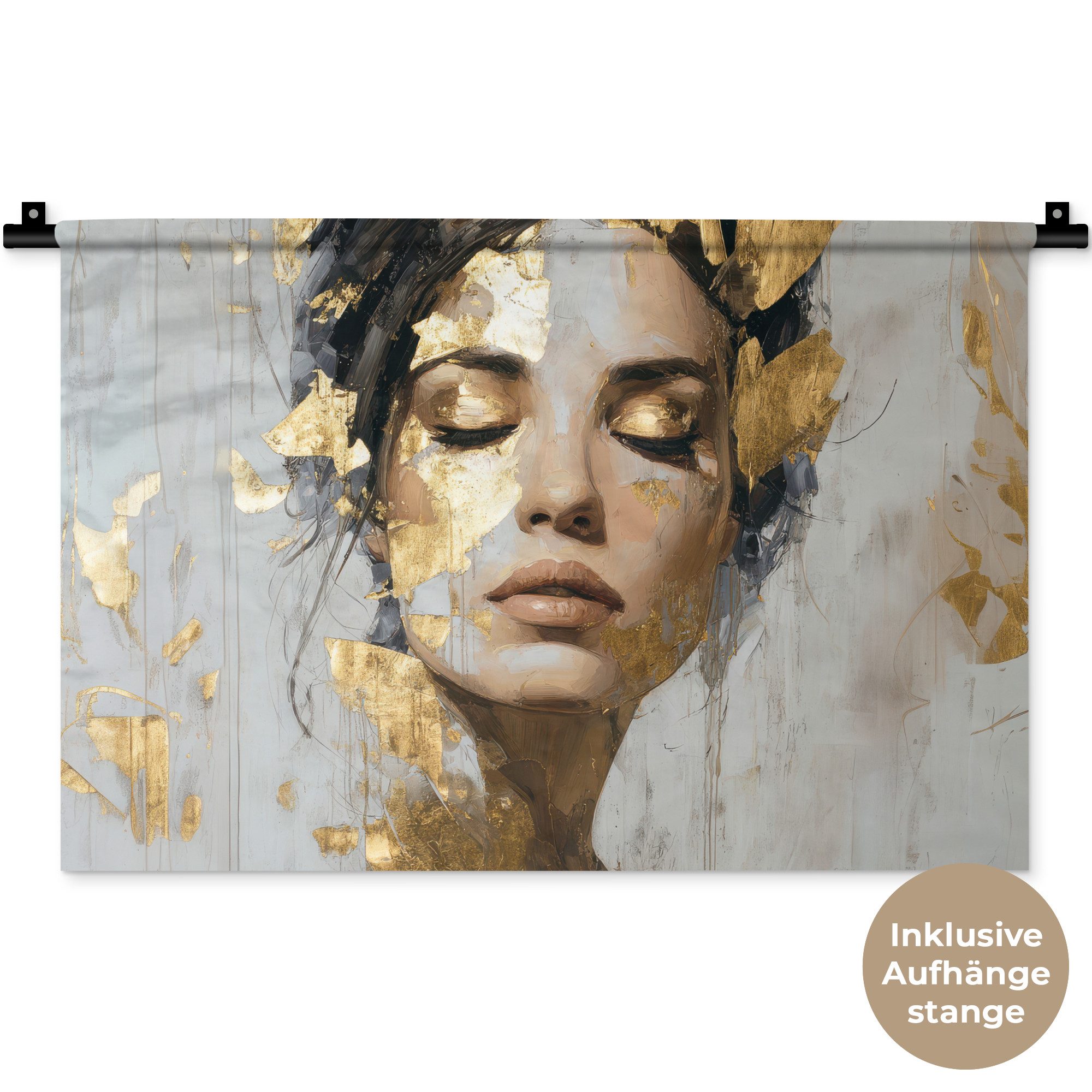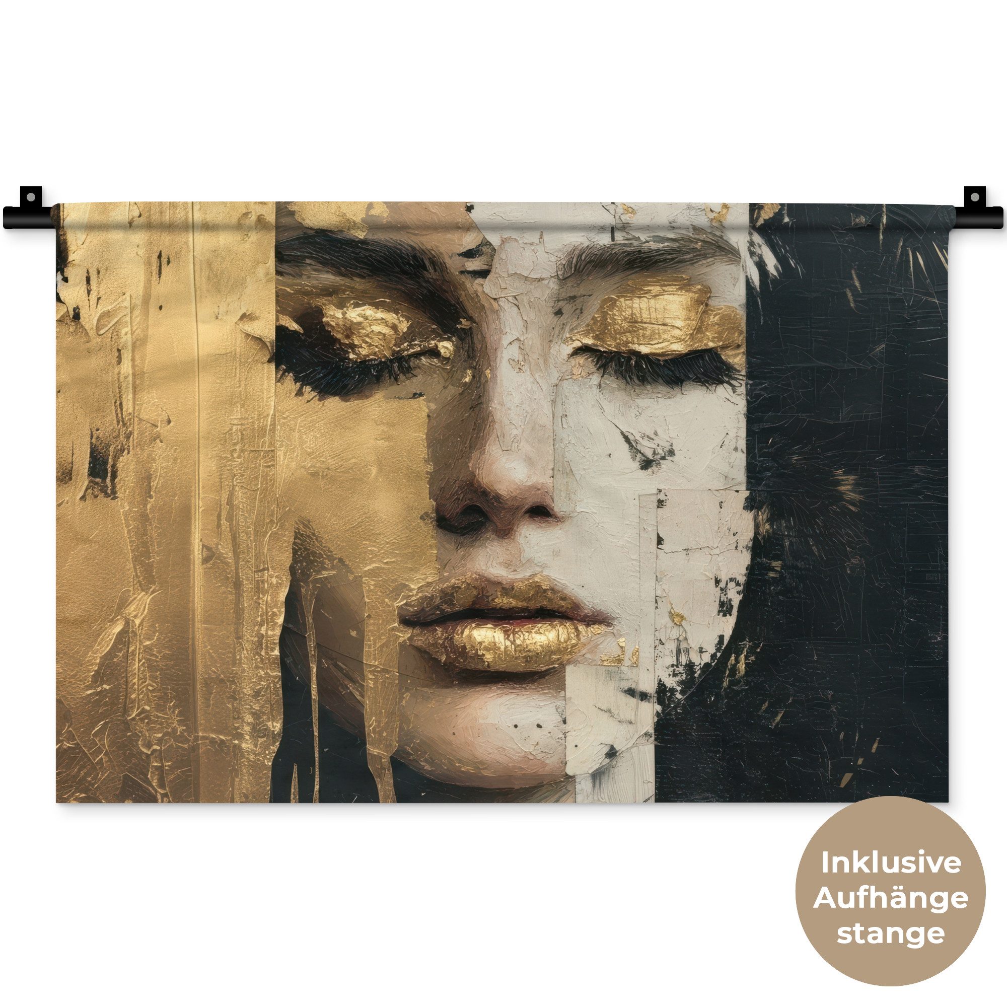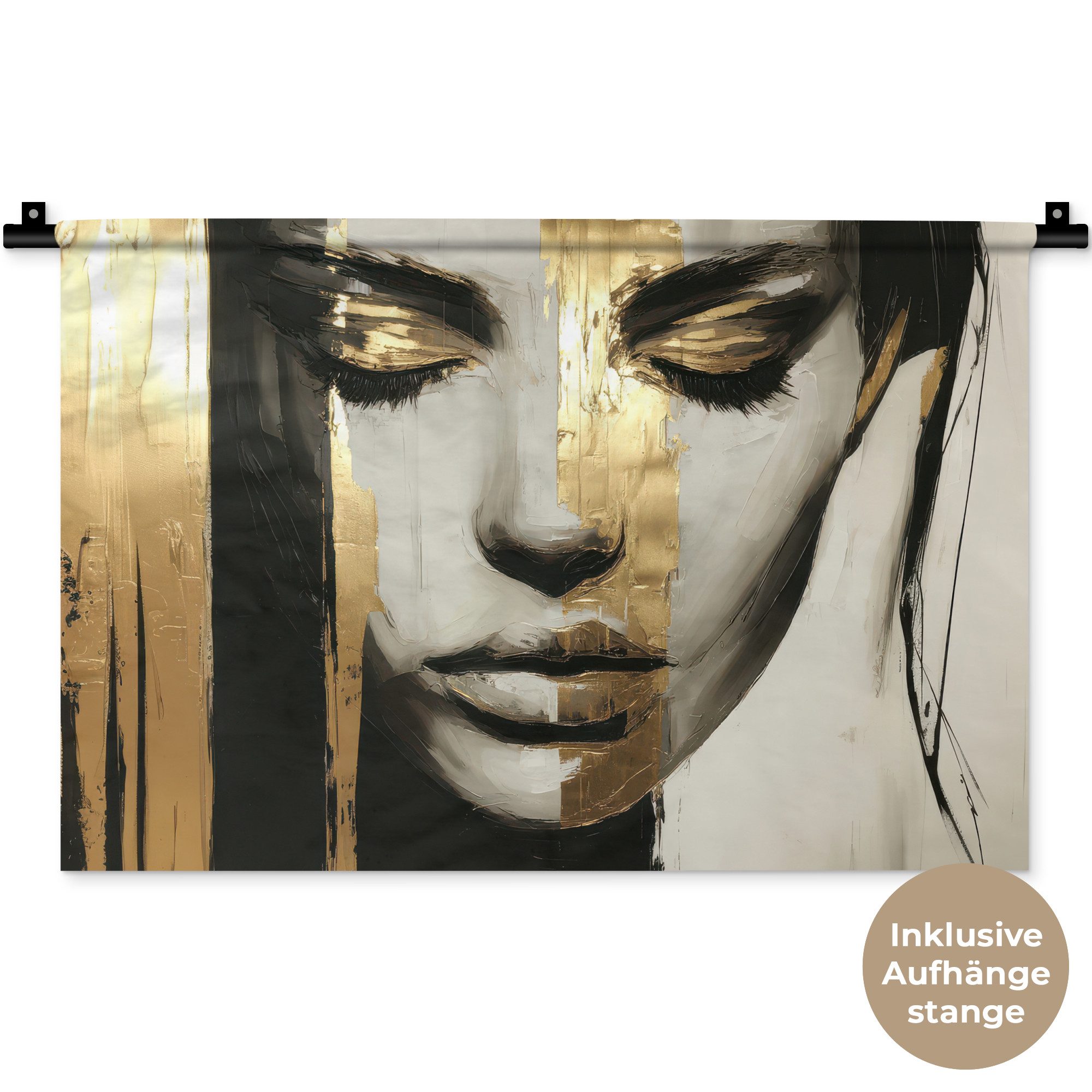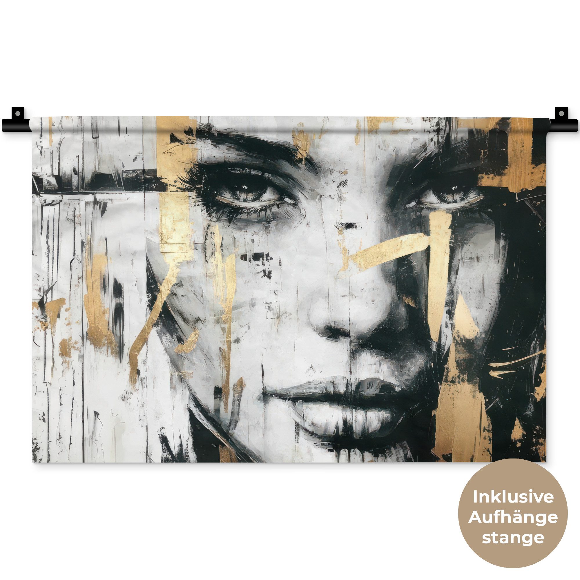 Das schwarz-weiße Porträt einer Frau mit intensivem Blick ist teilweise mit goldenen Pinselstrichen übermalt. Die raue Textur und die vertikalen Linien verleihen dem Bild Kraft und Geheimnis.