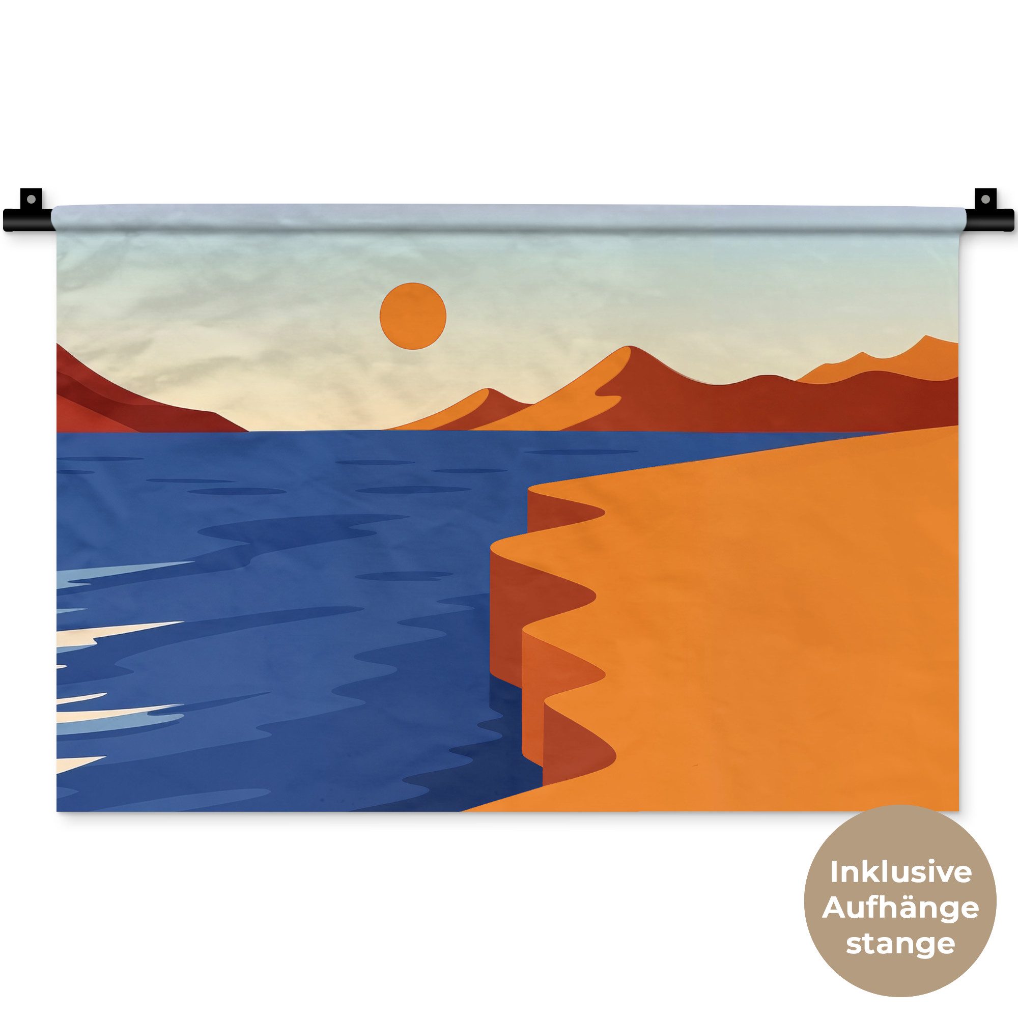 Eine stilisierte Landschaft zeigt eine orangefarbene Sonne über einem blauen Meer und orangefarbenen Klippen. Am Horizont sind bergige Formen unter einem blass gelb-blauen Himmel zu sehen.