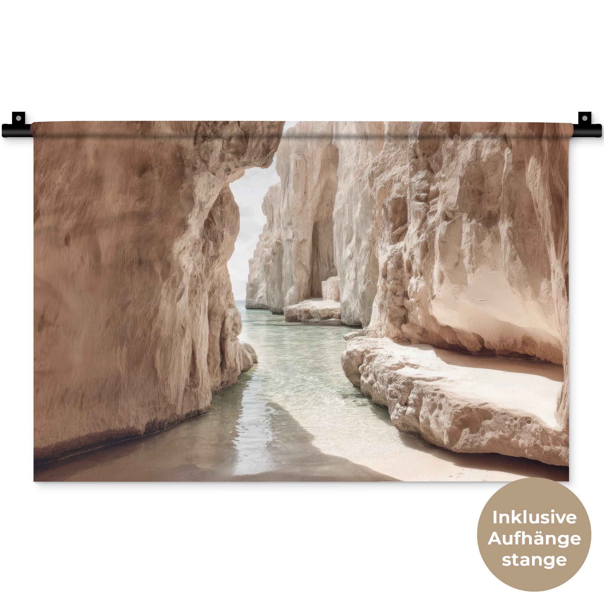 Eine schmale Passage zwischen hohen, sandfarbenen Felsformationen, durch deren Schlucht klares Wasser fließt.