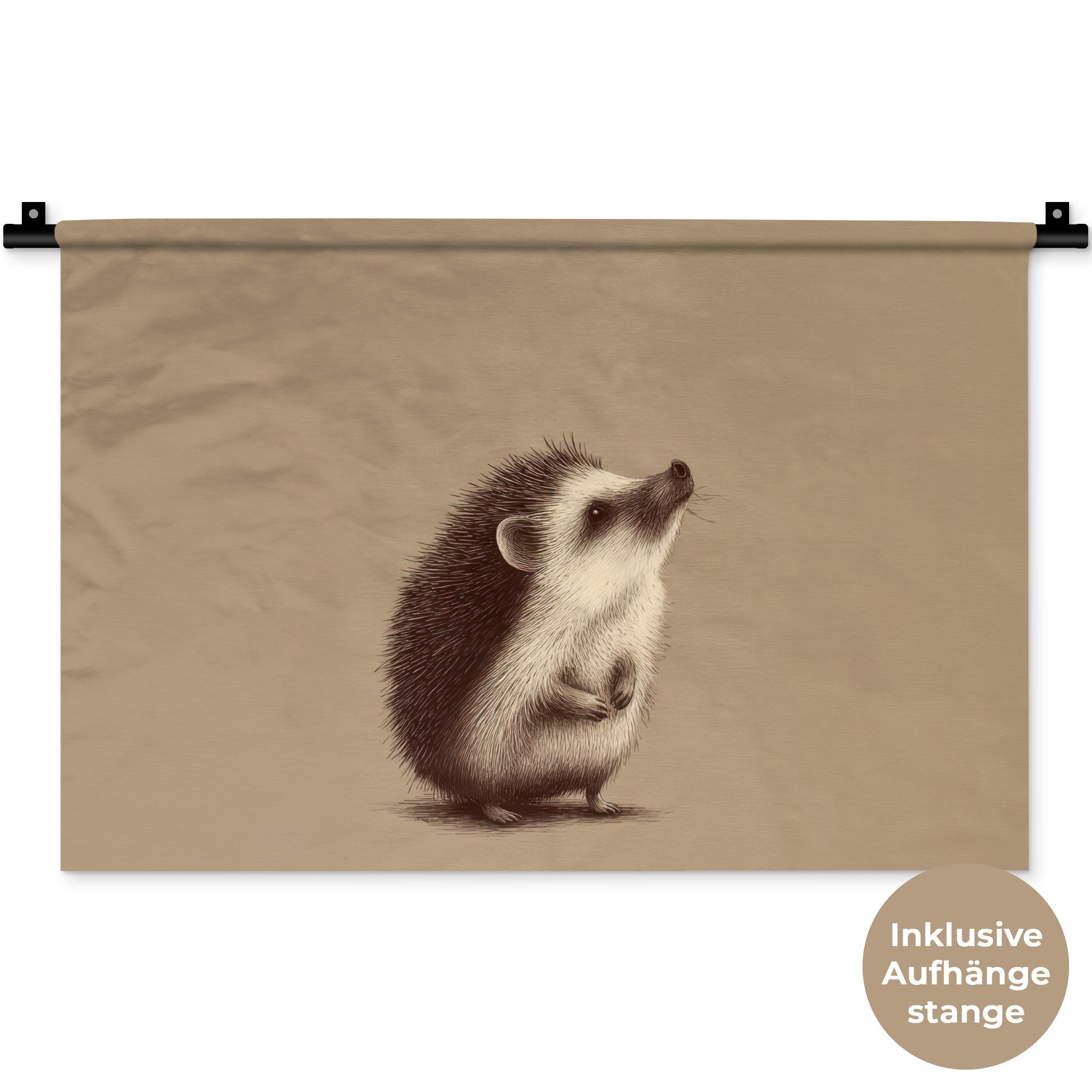 Ein detaillierter Igel schaut mit neugierigen Augen auf. Der warme beigefarbene Hintergrund unterstreicht seine weichen Stacheln und seine runde Form.
