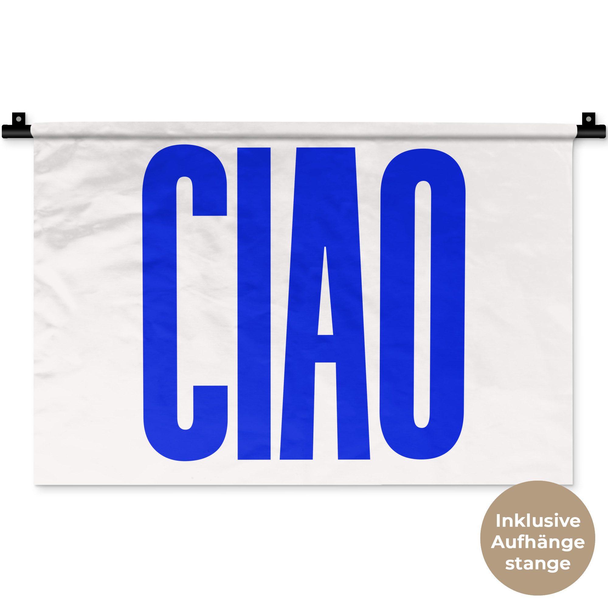 Das Wort "CIAO" steht in fetten, kobaltblauen Großbuchstaben auf hellem Hintergrund. Die Buchstaben sind eng aneinandergereiht und vertikal gestreckt, um eine starke Wirkung zu erzielen.