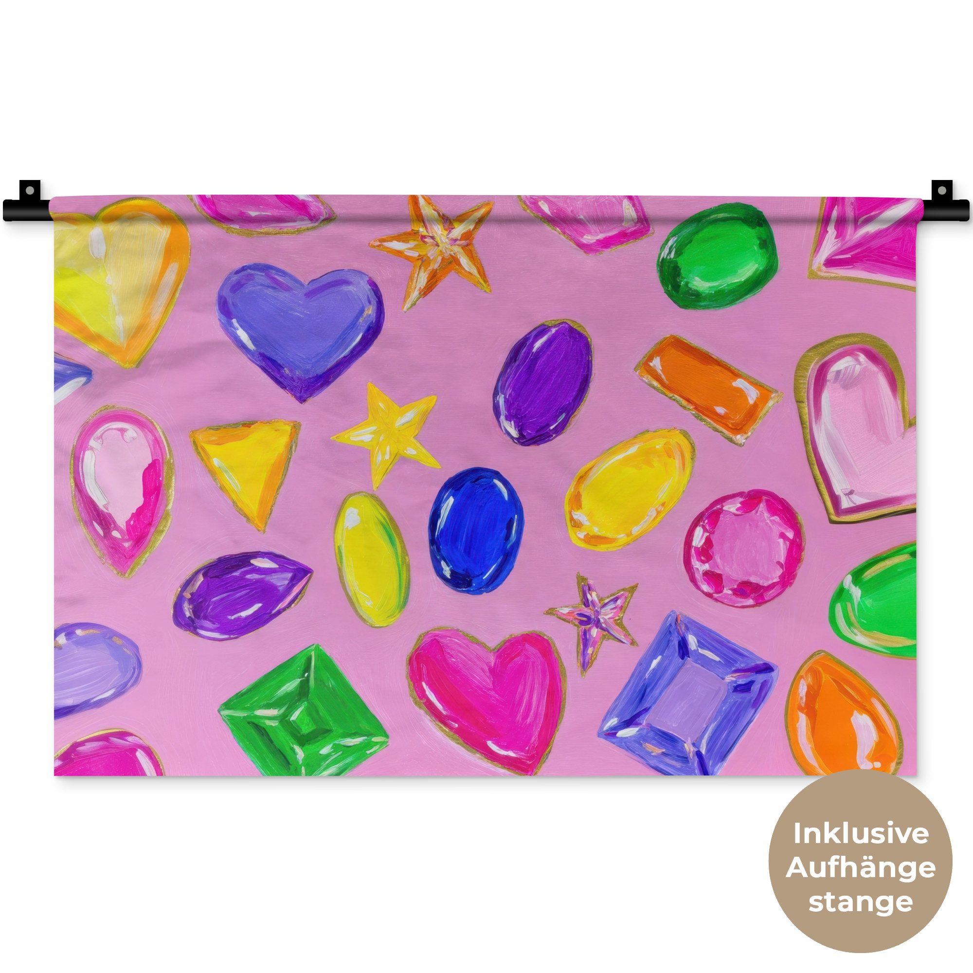 Verschiedene Formen von Edelsteinen in leuchtenden Farben sind auf einem rosa Hintergrund verstreut. Herz-, Stern- und ovale Formen sorgen für einen verspielten Look.