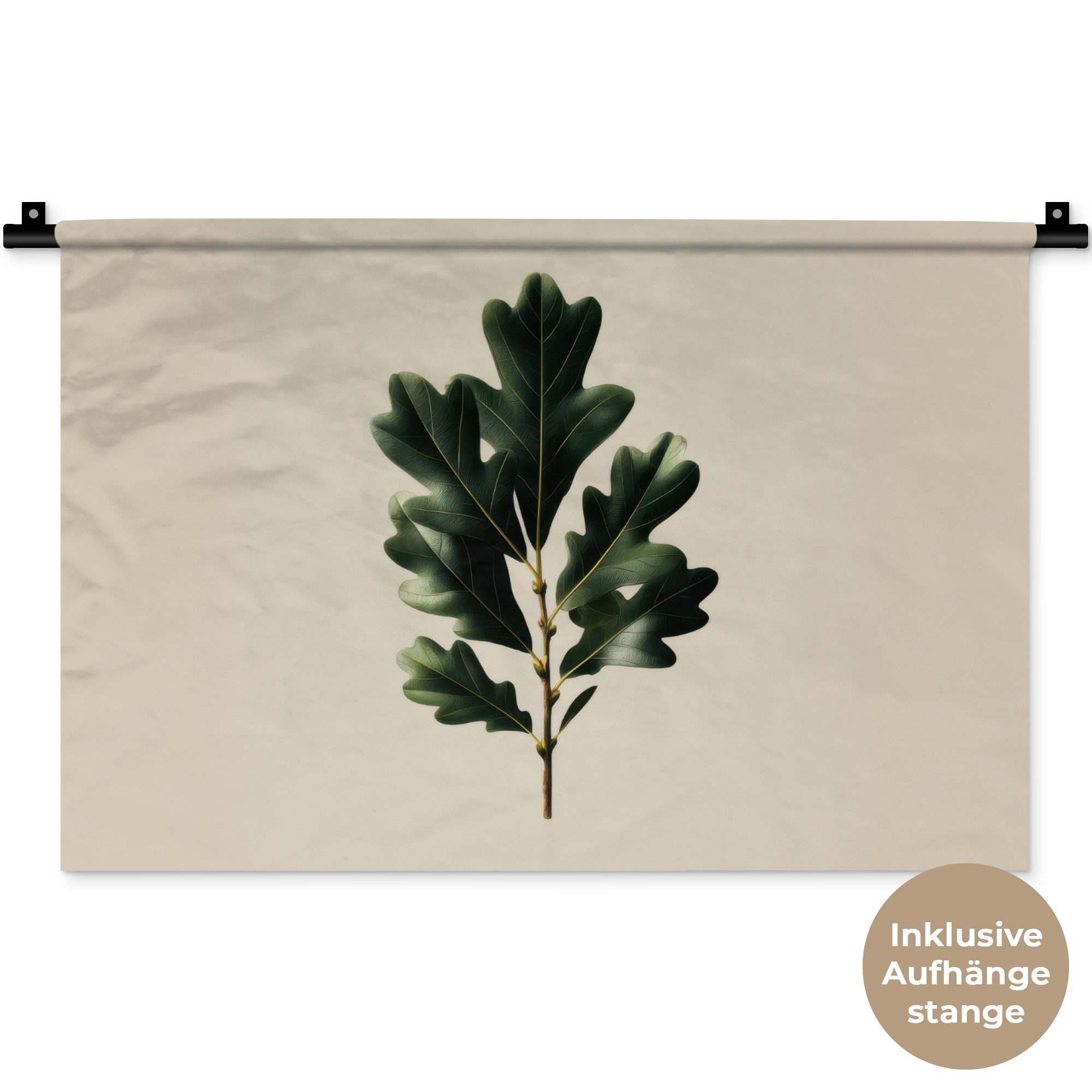 Dunkelgrüne Eichenblätter mit gewellten Rändern, dicht an einem einzelnen Zweig angeordnet, auf einfarbig beigem Hintergrund.