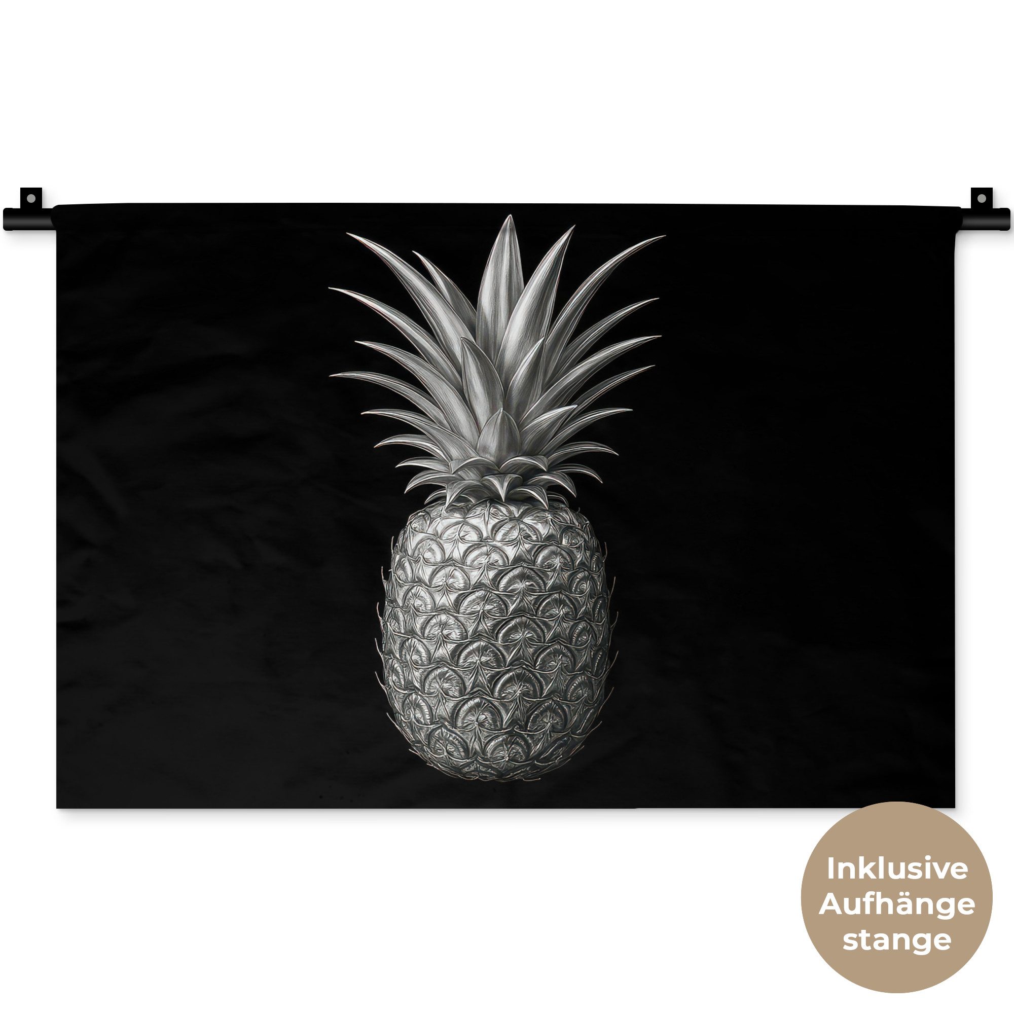 Eine detailreiche silberne Ananas mit scharf definierten Blättern und einem komplexen Muster auf der Schale. Die glänzende Textur hebt jede Rille und Kante hervor. Das Objekt wirkt massiv und skulptural, perfekt positioniert vor einem schwarzen Hintergrund, der den Kontrast verstärkt.