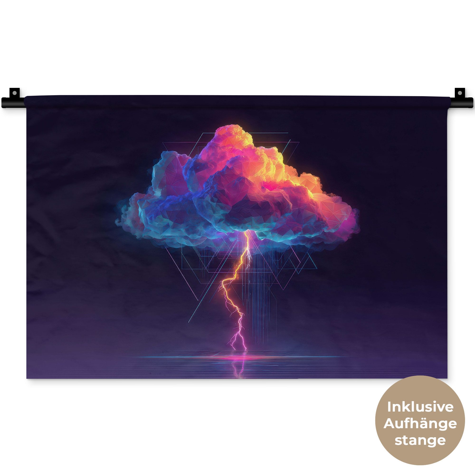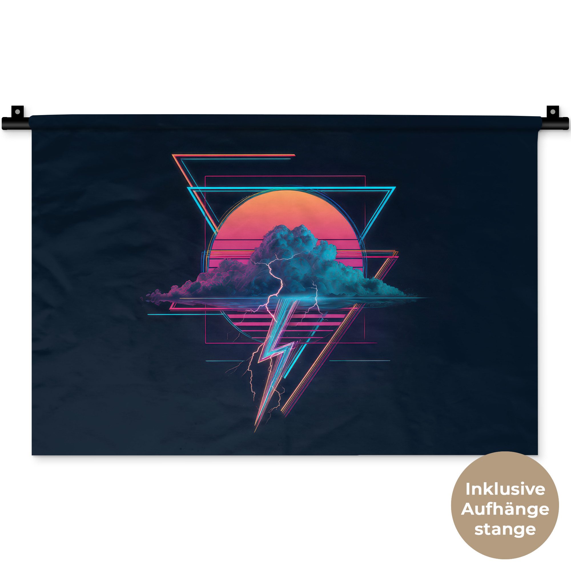 Eine Gewitterwolke mit einem Blitz schwebt vor einer stilisierten Sonne. Helle Linien und Dreiecke verleihen dem Bild einen Retro-Synthwave-Look.