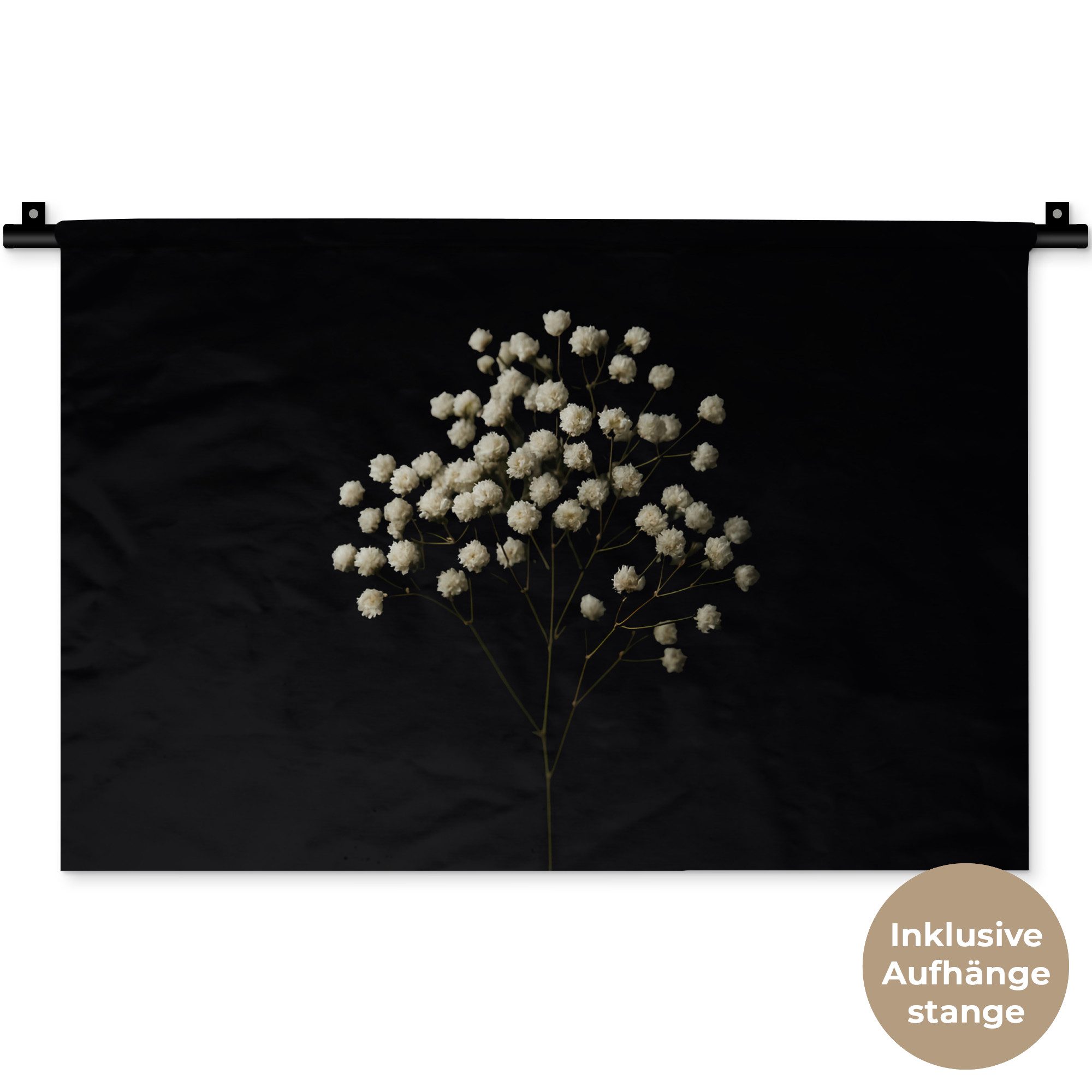 Ein zarter Schleierkrautzweig mit zahlreichen kleinen weißen Blüten steht abgeschieden vor einem tiefschwarzen Hintergrund. Das Bild wirkt zart und zerbrechlich.