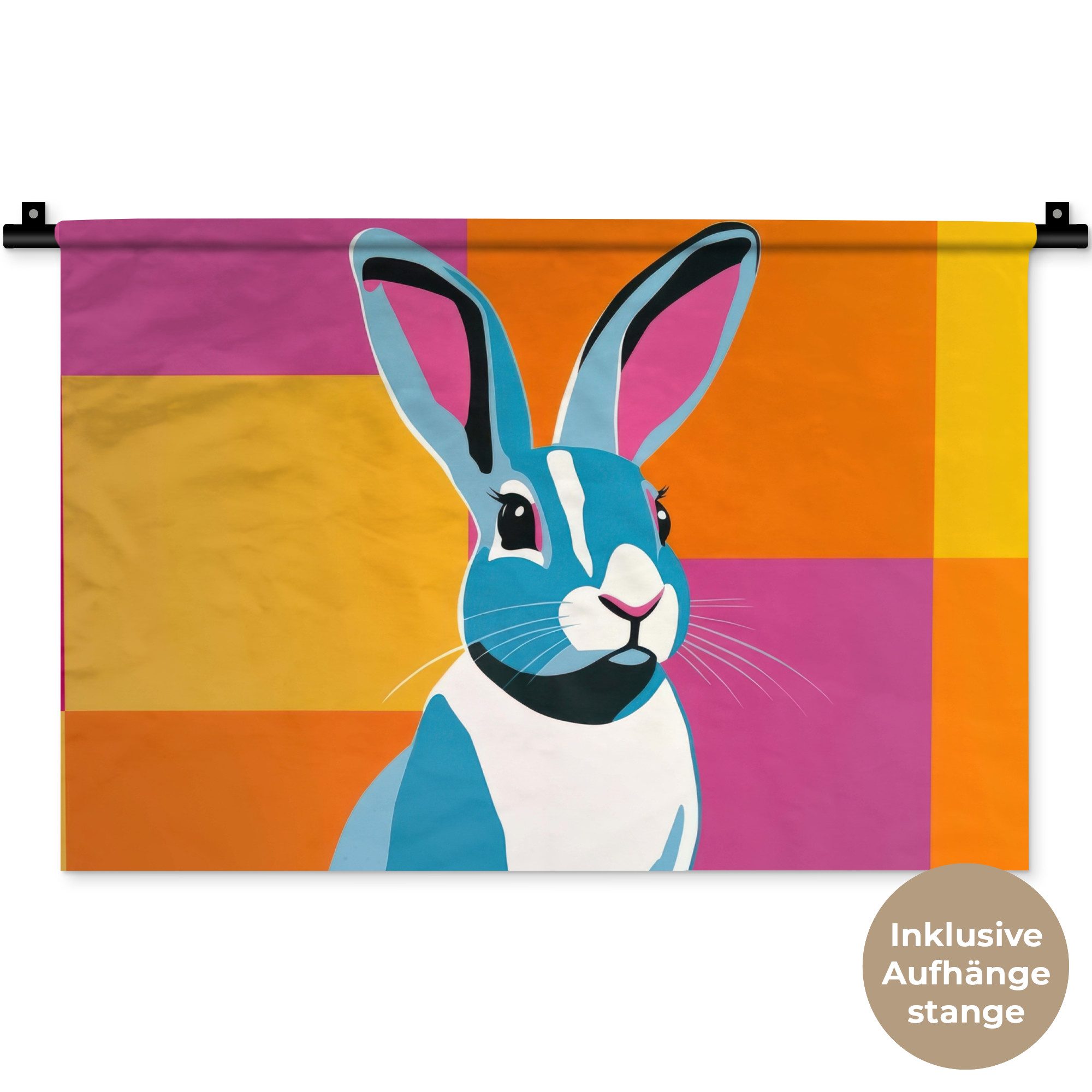 Ein leuchtend blauer Hase mit rosa Akzenten schaut den Betrachter von der Seite an. Der Hintergrund besteht aus quadratischen Farbflächen in Orange, Gelb und Lila.