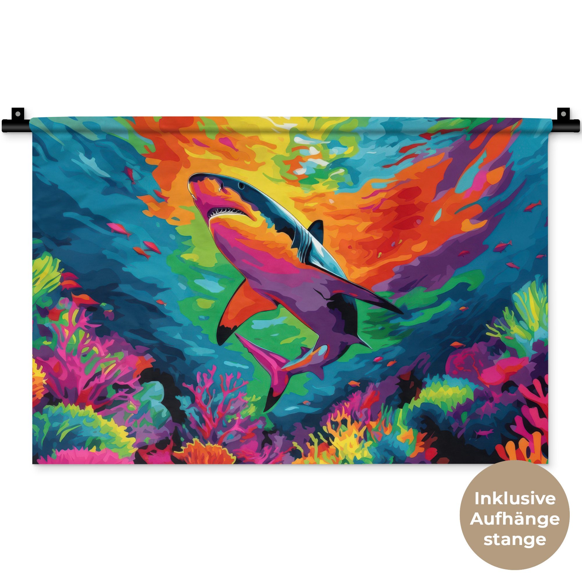 Ein Hai schwimmt in einem farbenfrohen Korallenriff, und das Wasser um ihn herum ist voller Farben: blau, orange, lila und grün. Der Hai hat auffällige rosa und orangefarbene Farbtöne, die seine Flossen betonen und dem Bild Dynamik verleihen.