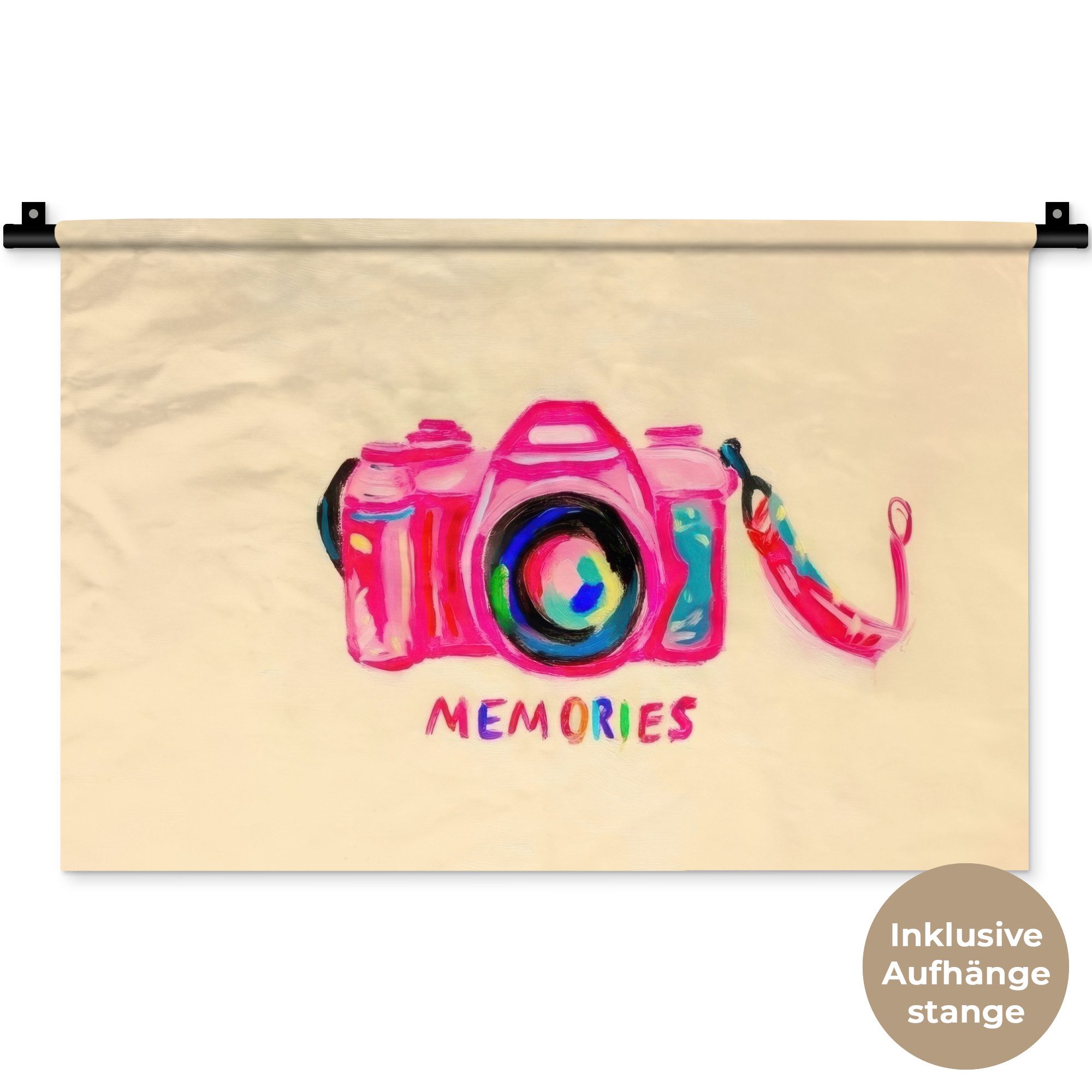 Eine leuchtend rosa Kamera mit Regenbogenobjektiv ist in verspielten Farben gemalt. Unter der Kamera steht in bunten Buchstaben das Wort "MEMORIES".