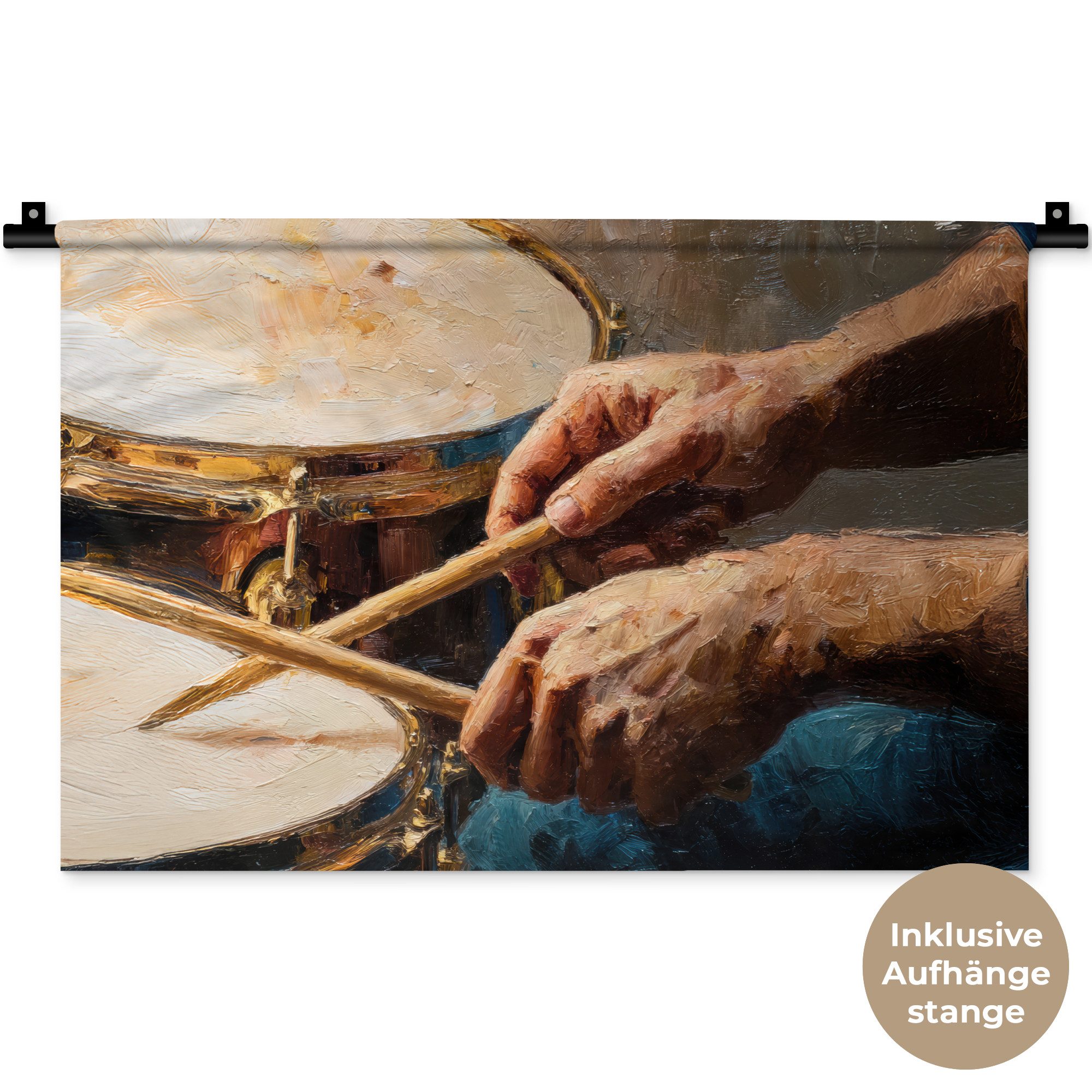 Nahaufnahme von zwei Händen, die Trommelstöcke über eine kleine Trommel halten. Die Pinselstriche sind grob und sichtbar, als wären sie mit dicken Schichten von Ölfarbe gemalt. Die warmen Farben und die Textur verleihen dem Bild Intensität und Handwerkskunst.
