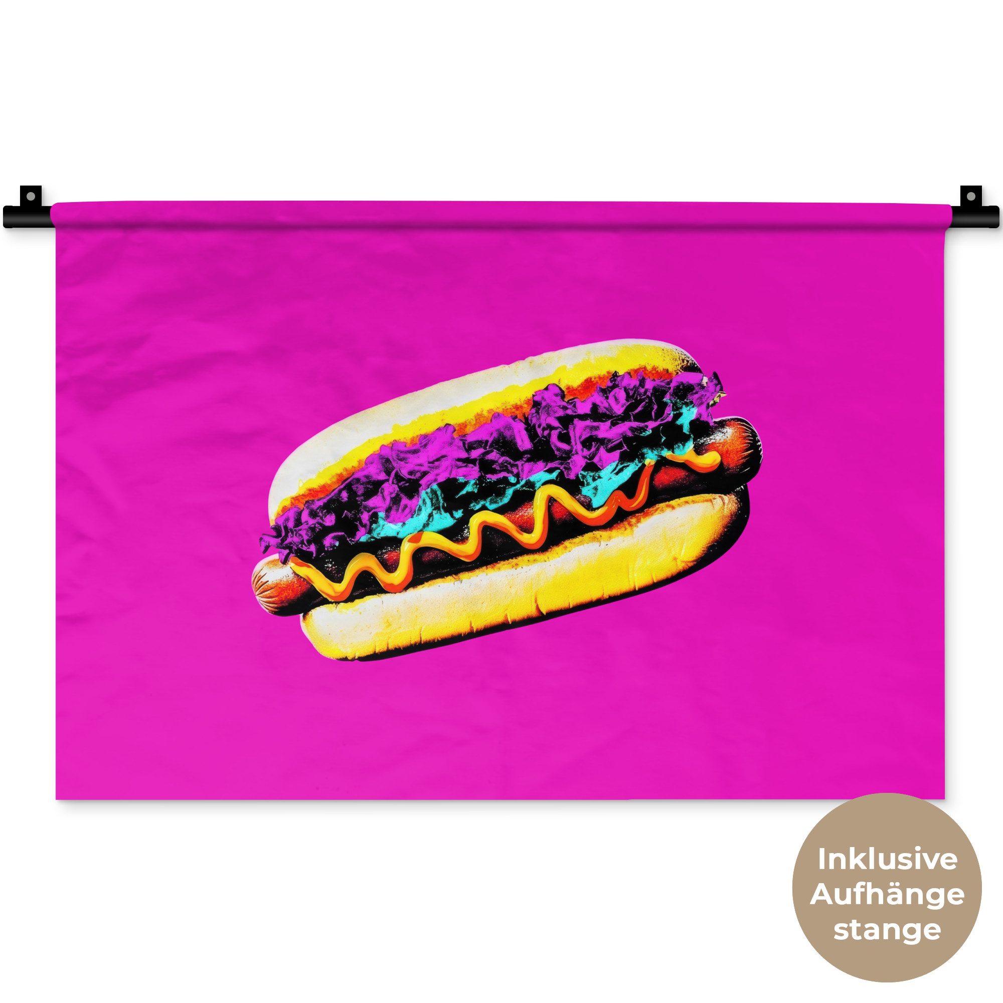 Dieser Hotdog ist alles andere als gewöhnlich. Mit leuchtend gelbem Senf, neonblauem Salat und hellviolettem Sauerkraut sieht er aus wie aus einem retro-futuristischen Traum. Das Fuchsia-Pink des Hintergrunds sorgt für einen tollen optischen Effekt.