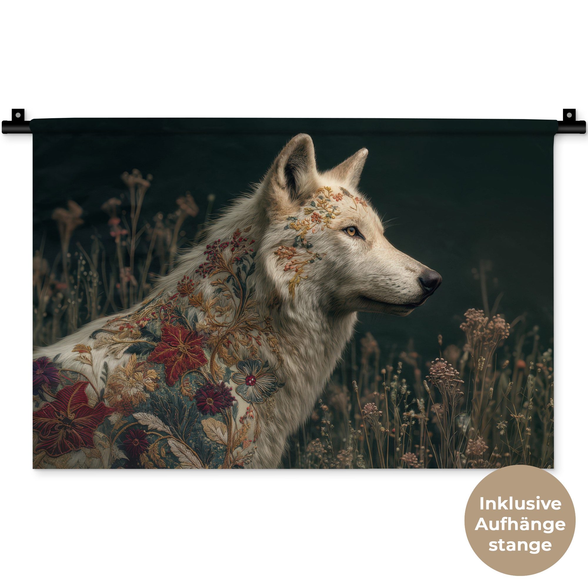 Ein scharfäugiger weißer Wolf steht zwischen hohen Feldblumen. Sein Fell ist reich verziert mit Stickereien aus roten, goldenen und blauen Blumen. Der dunkle Hintergrund und die weiche Beleuchtung verleihen dem Tier ein mystisches, fast legendäres Aussehen.