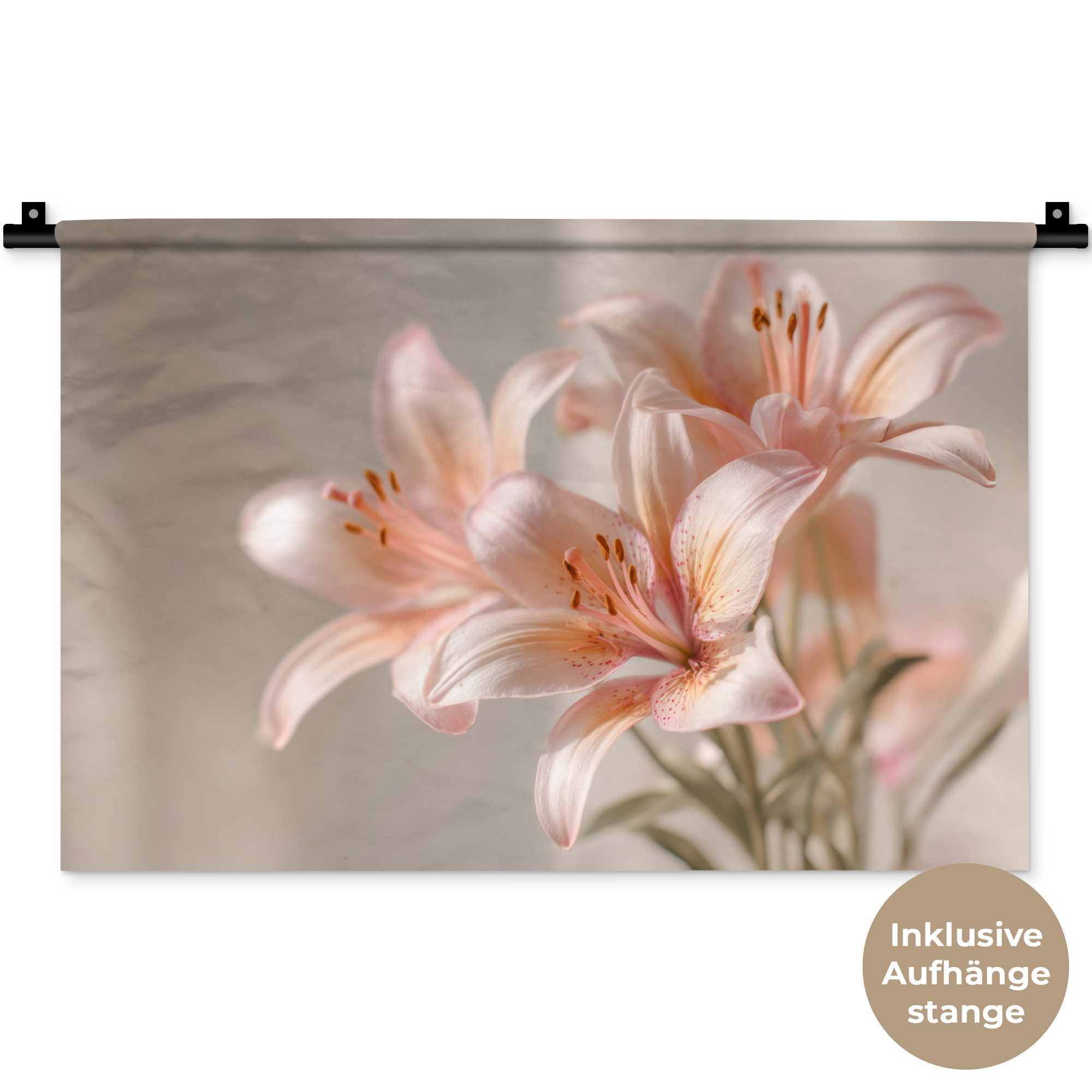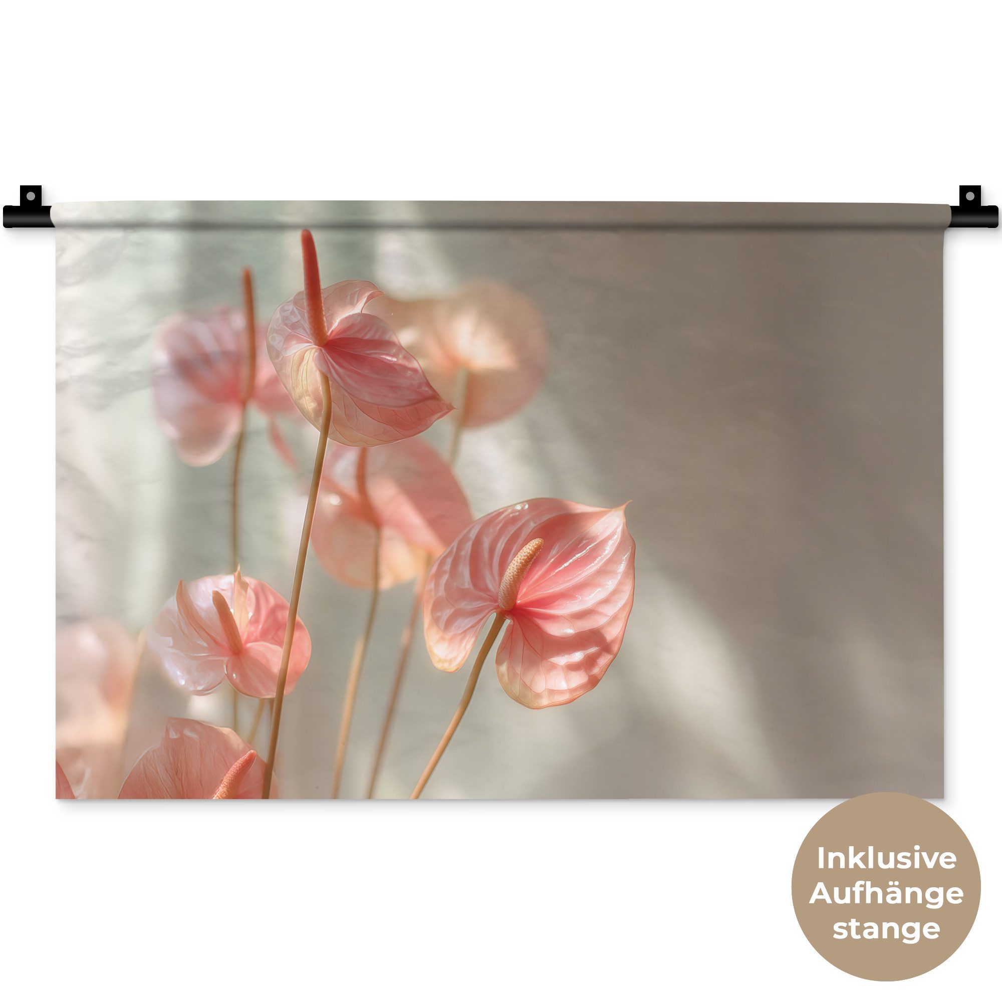 Glänzende, zartrosa Anthurienblüten mit langen Stielen fangen das Licht ein, das durch einen Vorhang fällt, und schaffen eine verträumte Atmosphäre vor einem weichen, neutralen Hintergrund.