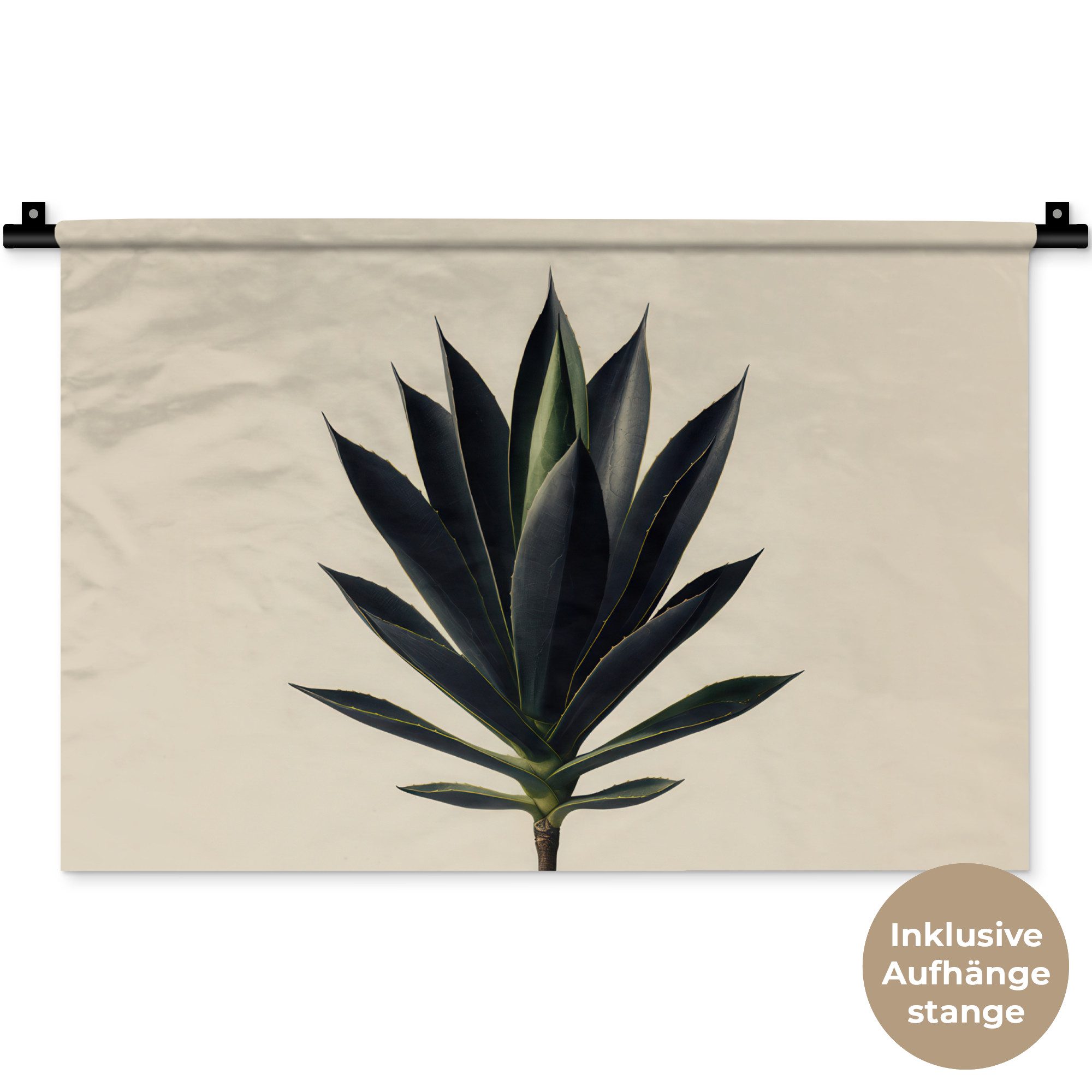 Eine Agavenpflanze mit festen, spitzen, dunkelgrünen Blättern, die symmetrisch aus der Mitte wachsen.