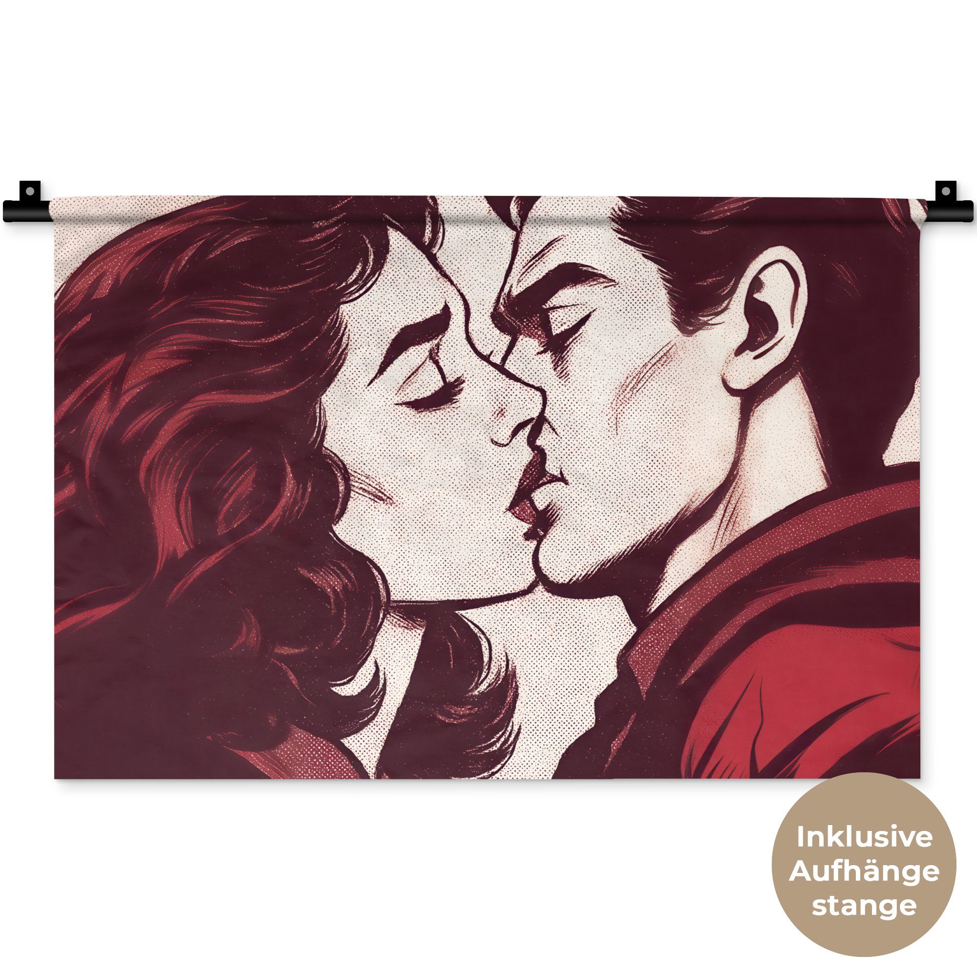 Zwei stilisierte Figuren Kuss begegnen sich intensiv. Das Bild ist im Cartoon-Stil mit Betonung auf dunklen Rot- und Cremetönen gehalten.