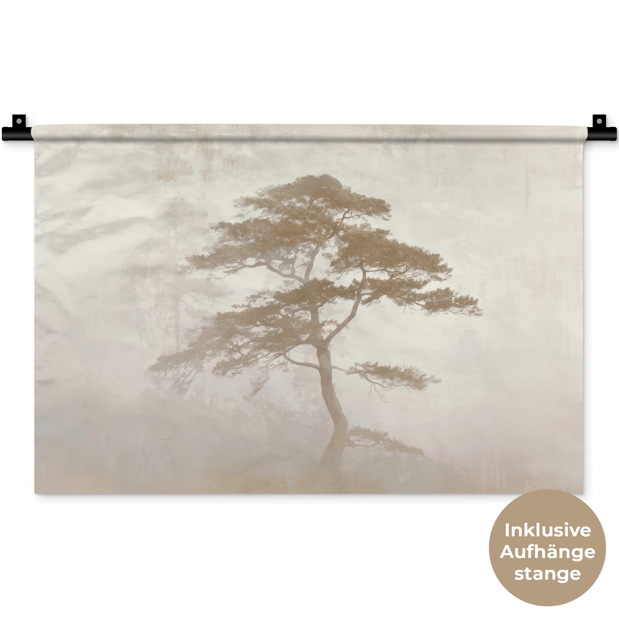 Ein einsamer Baum im orientalischen Stil hebt sich von einer vagen, nebligen Landschaft ab. Der weiche Hintergrund und der subtile Einsatz von Farben verstärken das Gefühl von Stille, Einfachheit und Zeitlosigkeit.