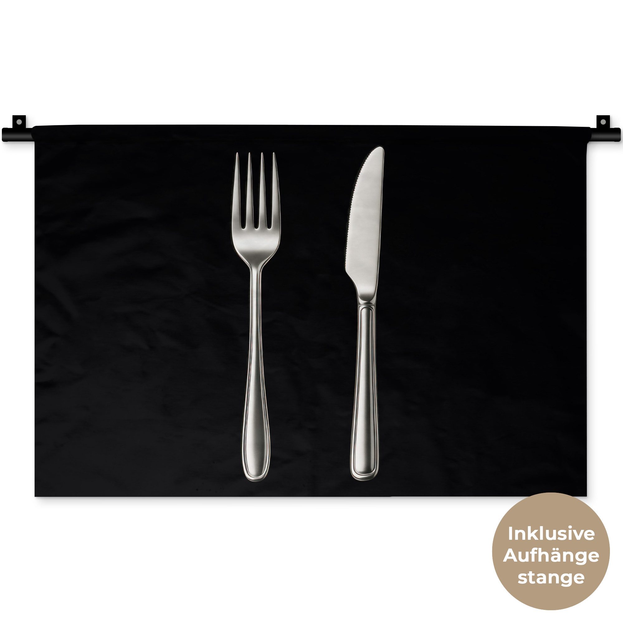 Eine Gabel und ein Messer aus glänzendem Metall, die nebeneinander auf einem schwarzen Hintergrund stehen. Die einfachen, eleganten Formen und die spiegelnden Oberflächen verleihen dem Besteck ein klassisches, zeitloses Aussehen.