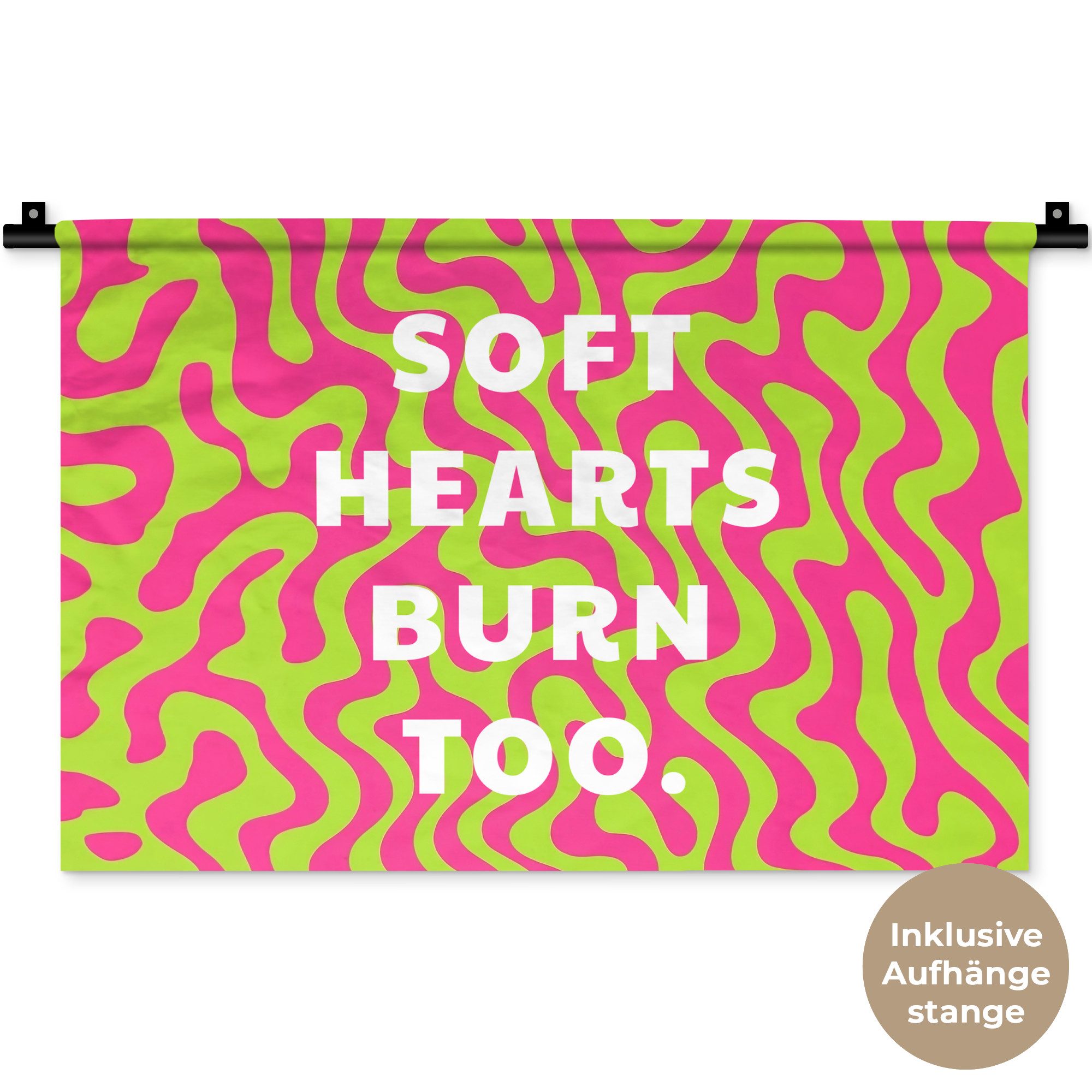Der weiße Text "Soft Hearts Burn Too." steht im Mittelpunkt eines abstrakten rosa-grünen Musters. Das Design ist spielerisch und doch mit emotionaler Kraft aufgeladen.