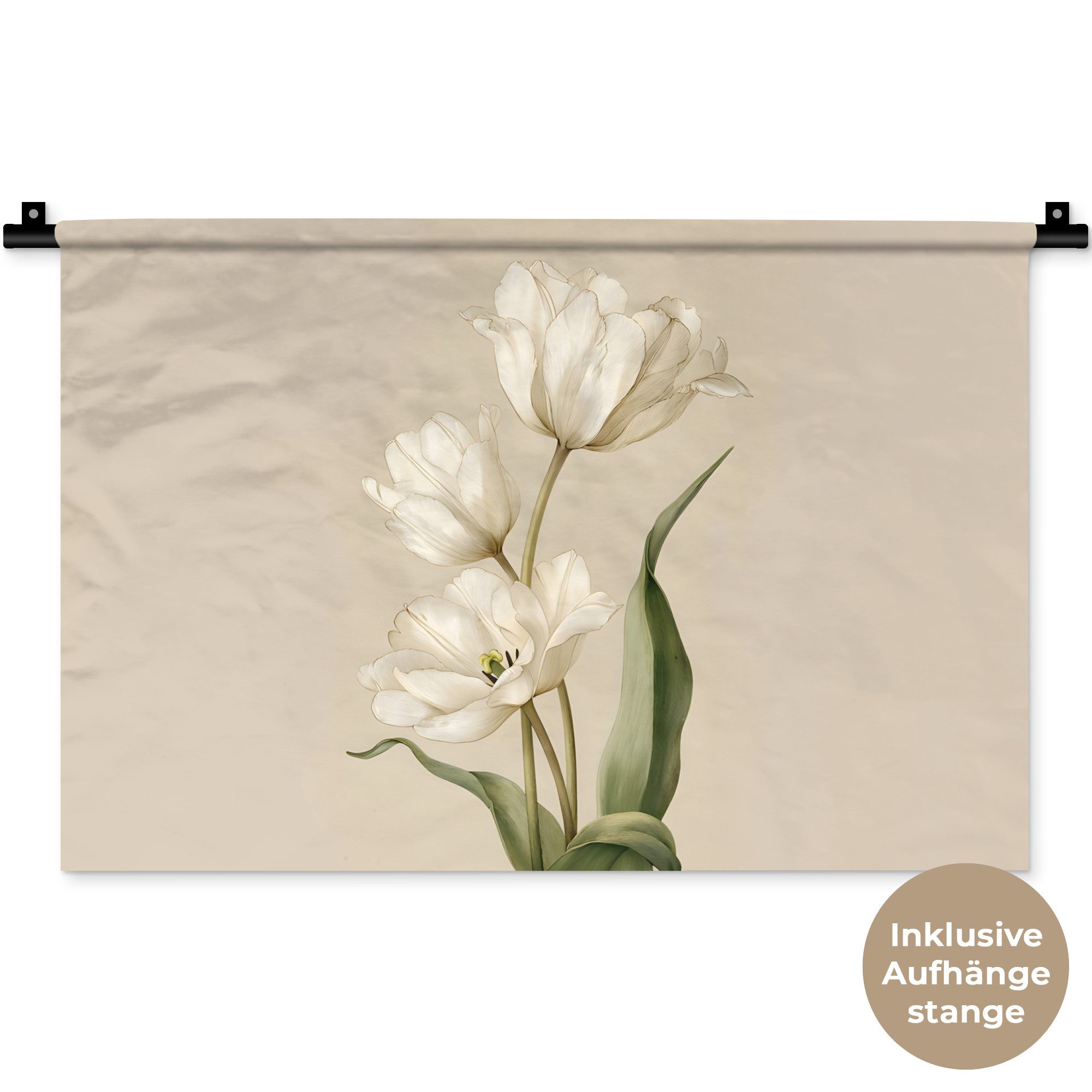 Drei weiße Tulpen mit grünen Blättern stehen anmutig vor einem beigen Hintergrund. Die sanfte Beleuchtung schafft eine elegante und ruhige Atmosphäre.