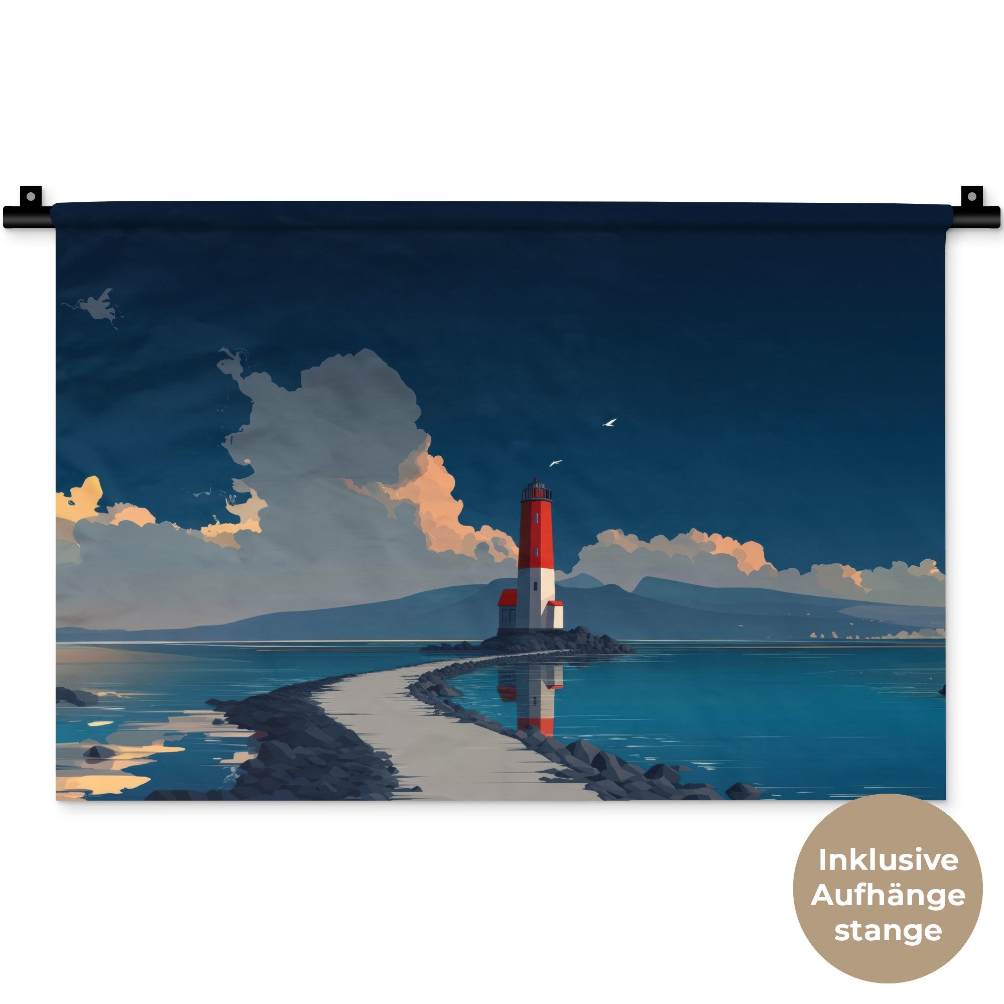 Ein rot-weißer Leuchtturm steht am Ende eines schmalen Dammes, der ins Meer führt. Der Himmel ist tiefblau und wolkenverhangen, und Vögel schweben darüber.