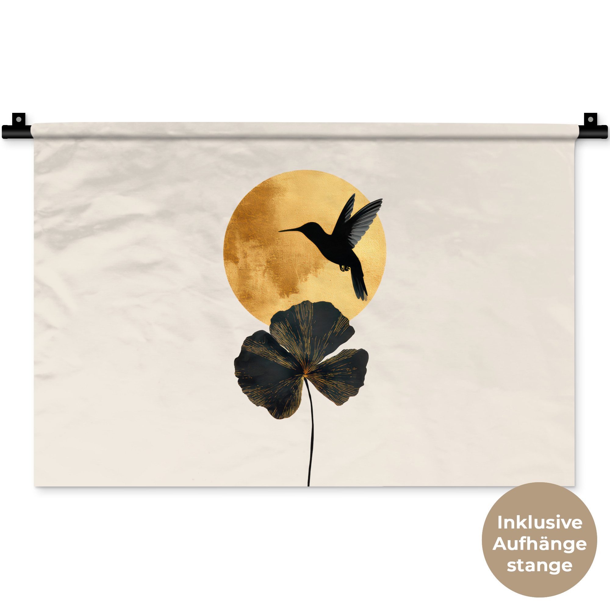 Schwarzer Kolibri über einer Blume, mit einem großen goldenen Kreis im Hintergrund.