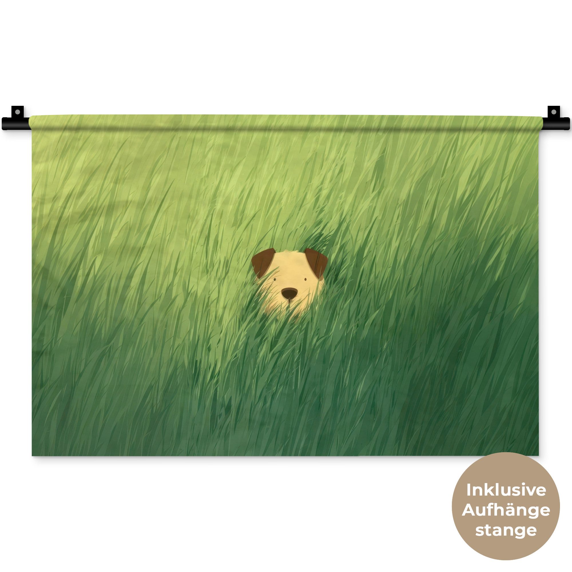 Ein kleines Hundegesicht mit braunen Ohren blickt neugierig über das wogende hohe Gras.