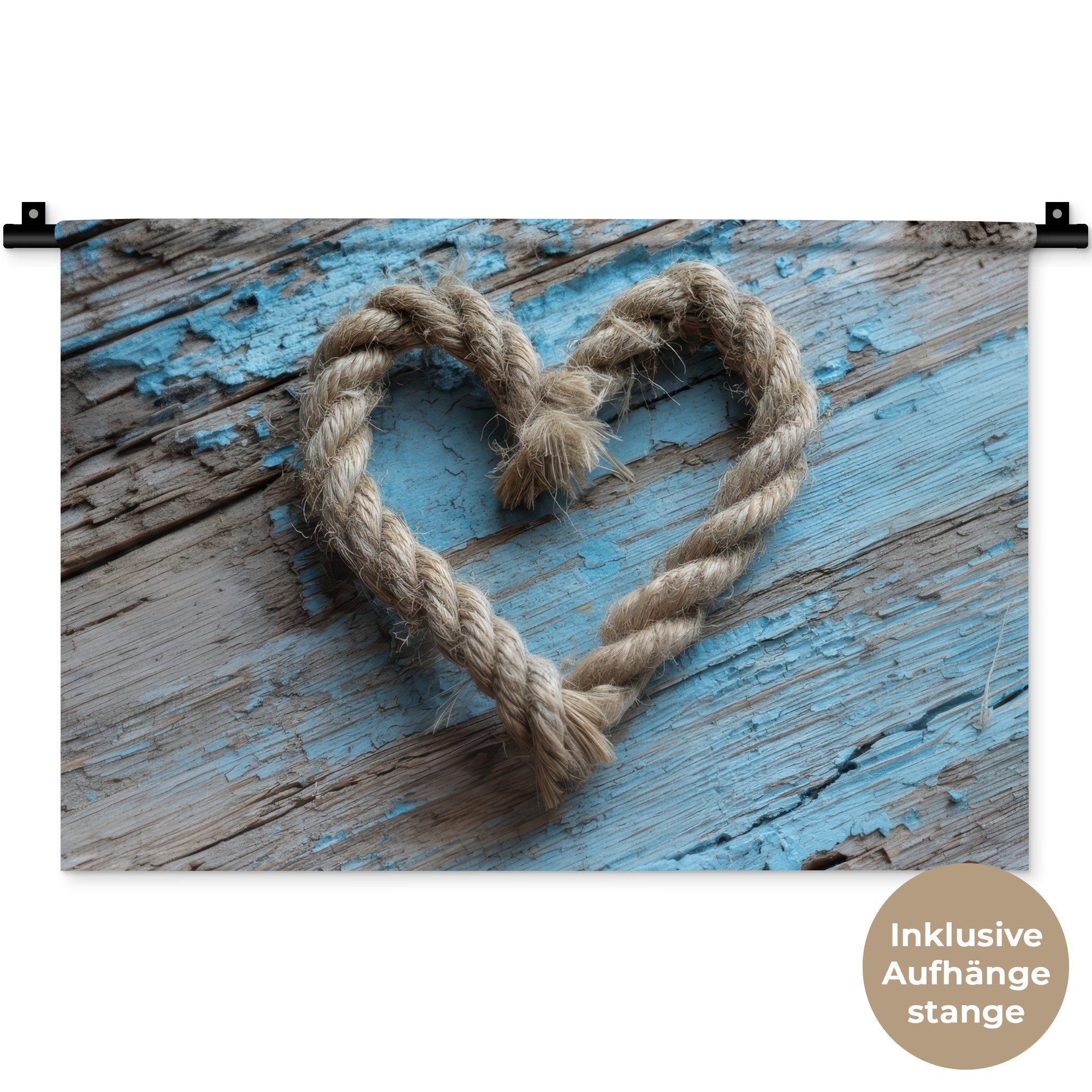 Ein herzförmiges, grobes Seil liegt auf einer verwitterten Holzoberfläche mit blau gestrichenen Flächen, die ein rustikales Aussehen verleihen.