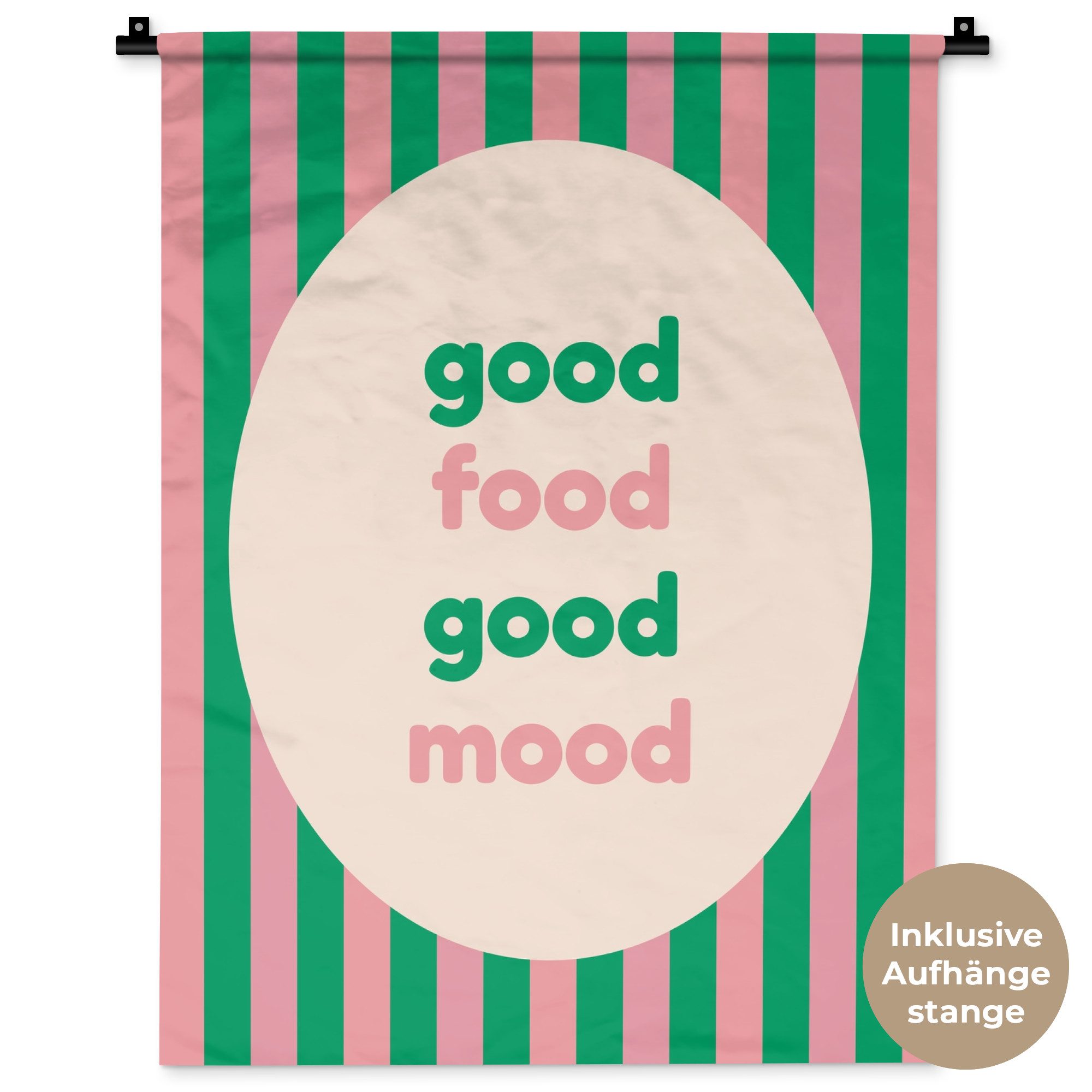 Die rosafarbenen und grünen Worte stehen in der Mitte eines beigen Ovals, das von vertikalen rosafarbenen und grünen Streifen eingerahmt wird, die die fröhliche Botschaft unterstreichen.