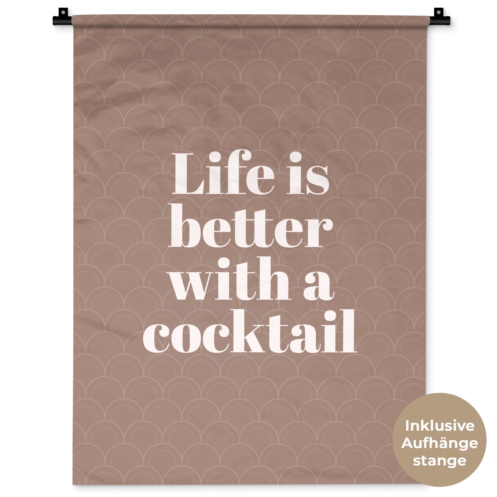 Der Satz "Life is better with a cocktail" steht in weißen Serifenbuchstaben auf einem weichen braunen Muster aus Halbkreisen. Die Stimmung ist stilvoll und leicht verspielt.