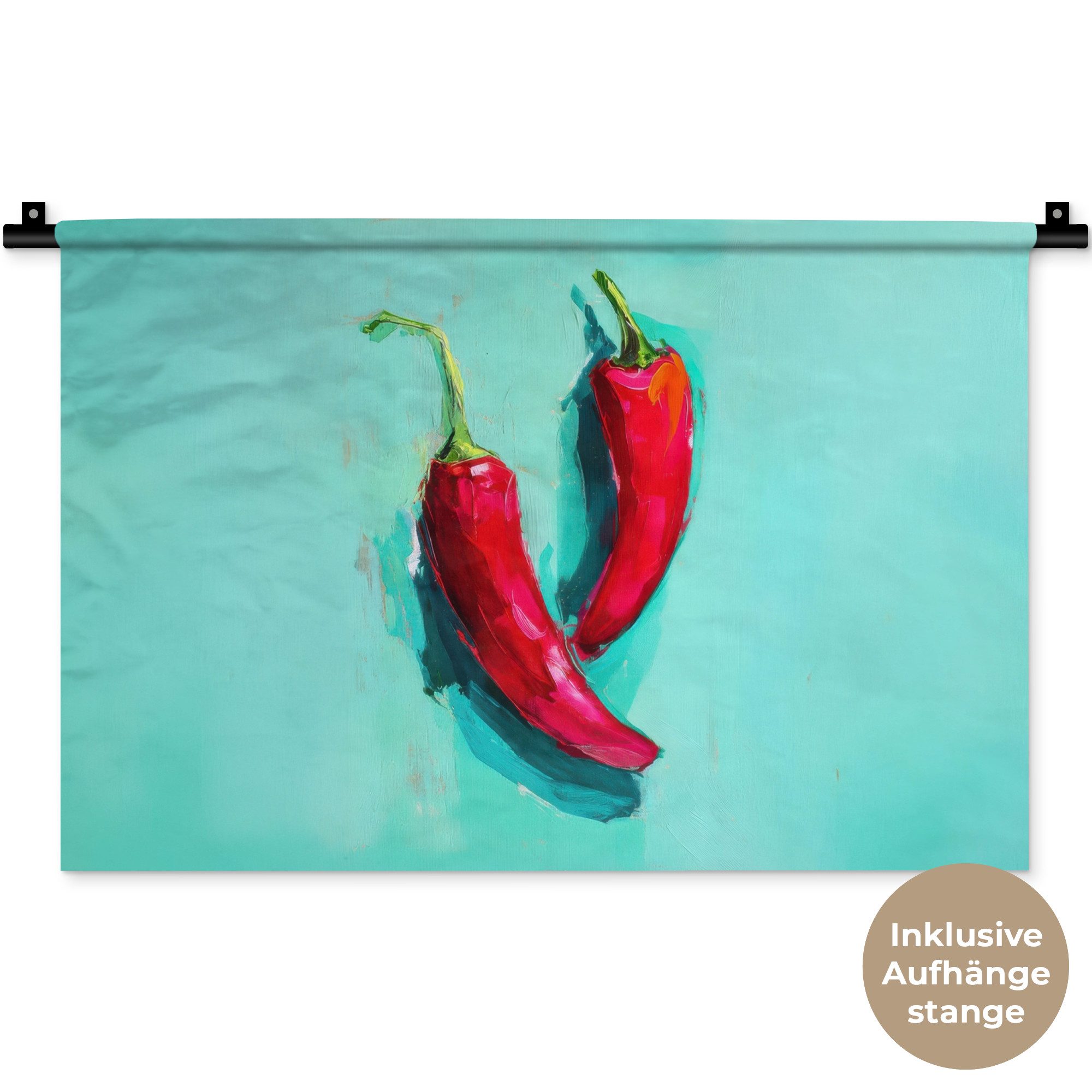 Zwei leuchtend rote Chilischoten liegen diagonal auf einem türkisfarbenen Hintergrund. Der Farbkontrast sorgt für einen kräftigen, modernen Look.