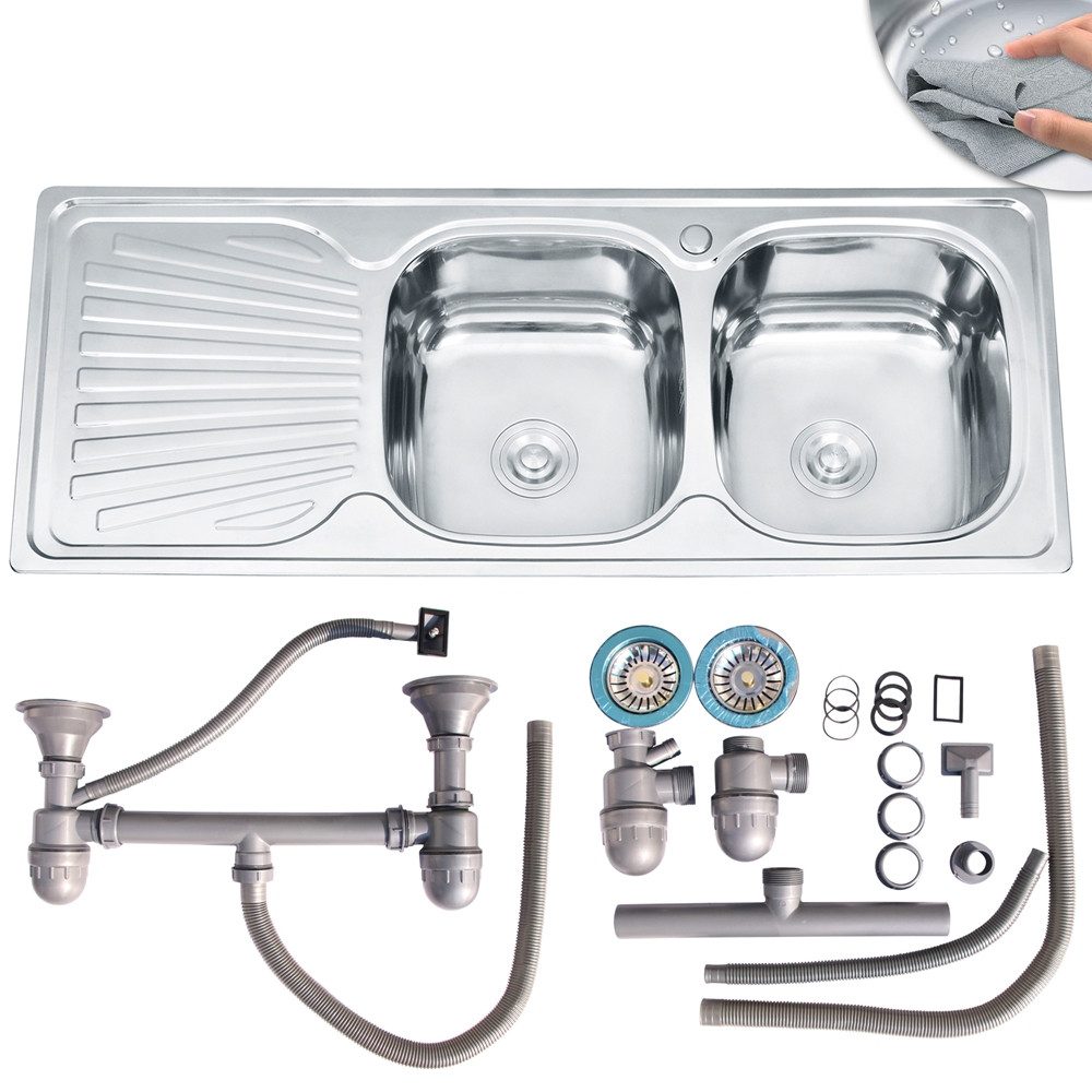Lieferumfang | 1 x Doppelspüle aus Edelstahl mit Ablage inkl. XXL Zubehör Paket Ablaufgarnitur, usw. |