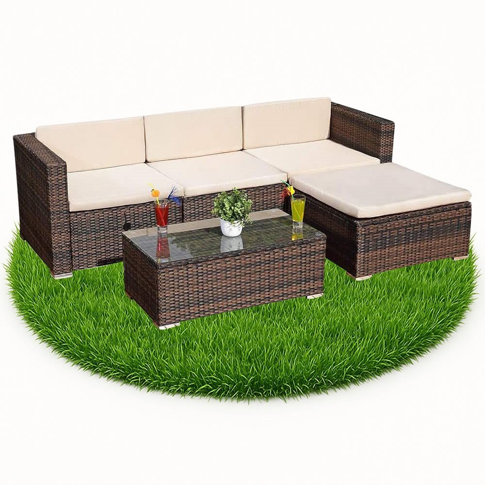 Sie möchten Ihrem Außenbereich eine gemütliche Atmosphäre verleihen? Mit diesem Möbelset aus Polyrattan lässt sich diese Aufgabe im Handumdrehen lösen. Das Set besteht aus einem mehrteiligen Sofa, einer Ottomane und einem Tisch. Das Sofa und die Ottomane lassen sich beliebig kombinieren – dank des modularen Designs können Sie die Möbel flexibel zusammenstellen oder getrennt platzieren. Die braune Farbgestaltung mit schwarzen Akzenten hebt die Schönheit des Polyrattans hervor. Für einen edlen Lounge-Stil sowie mehr Komfort sorgen die cremefarbenen, wasserabweisenden Sitz- und Liegekissen aus 100% Polyester.