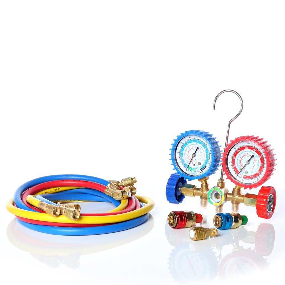 Mucola bietet ein umfangreiches Klimaanlagen-Zubehör für Monteure an, das aus hochwertigen Komponenten besteht. Das Set umfasst eine 2-Wege-Monteurhilfe mit Schlauchset, Schauglas, Manometer, Vakuumpumpe und 2 Schnellkupplungen mit Adaptern für den Gebrauch in Auto-Klimaanlagen. Die Schläuche sind für den Einsatz mit verschiedenen Kältemitteln wie R134a, R22, R12 und R502 geeignet und haben einen Berstdruck von 275 bar. Dieses Wartungsset ermöglicht eine präzise und effektive Klimaanlagen-Befüllung sowie eine gründliche Kältemittelprüfung. Mit dem vielseitigen R134a Füllset können Klimaanlagen zuverlässig gewartet und repariert werden.