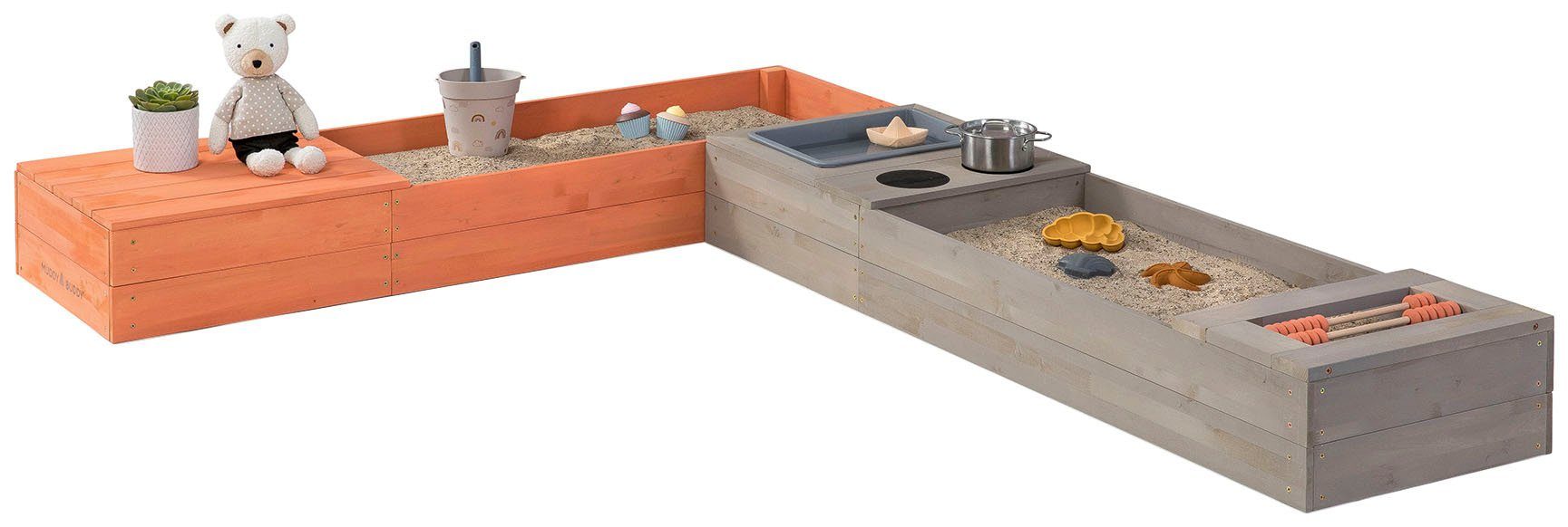 Lieferumfang | 1 Abakus - mit 2 Reihen, 1 Kunststoffwanne für Wasser oder Sand, 1 großes Staufach für Sandspielzeug, 2 aufgedruckte Herdplatten, Elemente lassen sich flexibel stellen (z.B. nebeneinander, hintereinander, über Eck), Holzschutz vorbehandelt!, Höhe der Sitzfläche ca. 20 cm, Lieferumfang ohne Dekoration, aus massivem Zypressenholz gefertigt, bestehend aus 2 einzelnen Elementen (1x grau, 1x farbig), hochwertiger, kompakter Sandkasten, inkl. Sandkastenvlies |