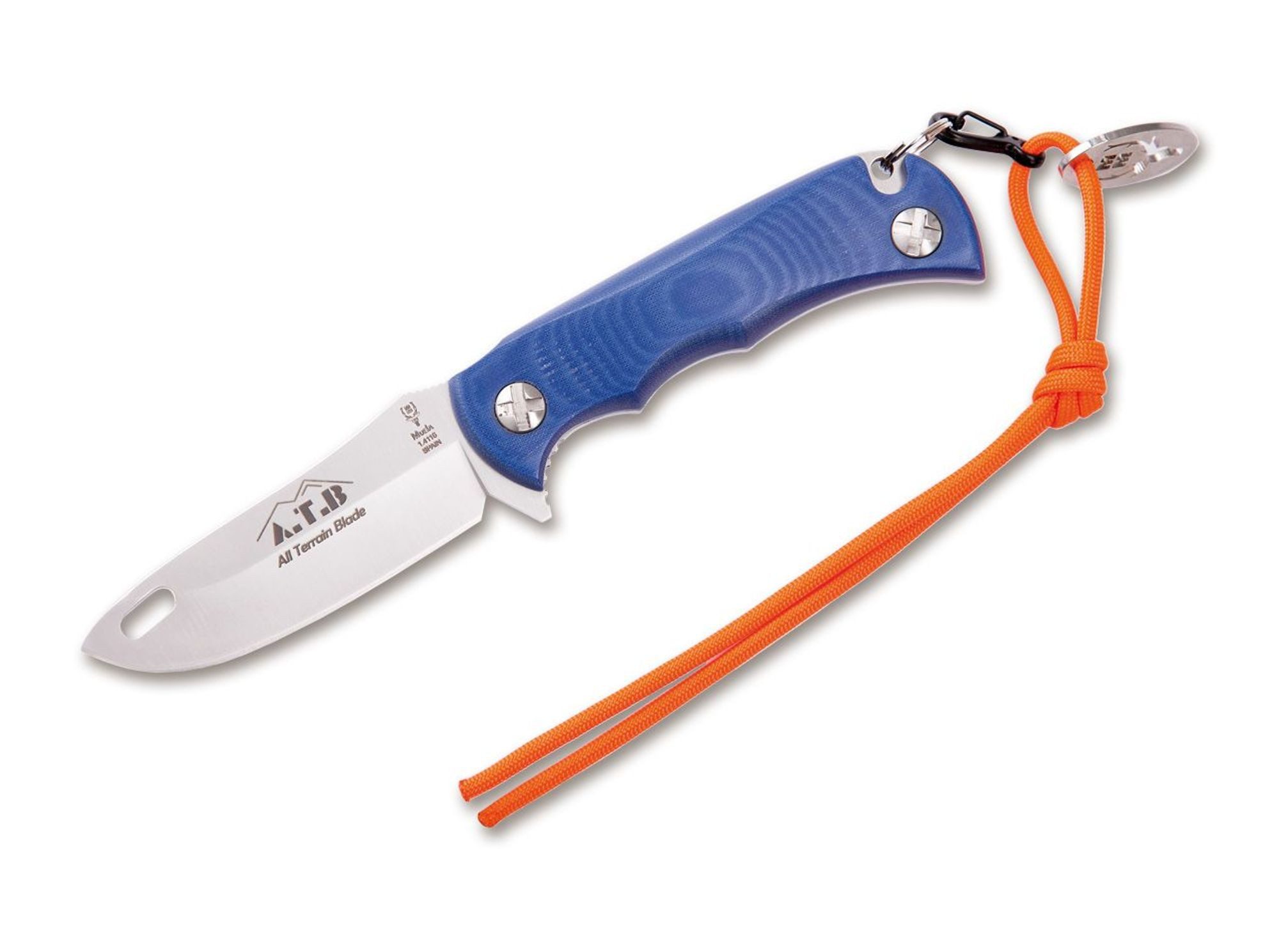 Das All Terrain Blade (kurz A.T.B.) wartet neben zahlreichen durchdachten Details vor allem mit einem bezentralen Clou auf. Einerseits ist das A.T.B. ein vielseitiges robustes Flachangelmesser für den Outdoor- Einsatz. Darüber hinaus können die Griffschalen aus blauem Micarta aber auch umgeschraubt werden, sodass die feststehende Klinge verdeckt ist und der multifunktionale Erl freiliegt. Dieser bietet einen Schäkelöffner und Sechskantschraubendreher in drei Größen. Die Aussparung für die Fangriemenöse in der Griffschale lässt im abgedeckten Zustand der Klinge ein kurzes Stück der Schneide frei, der so zum Beispiel zum Abisolieren von Kabeln genutzt werden kann. Die mit orangefarbener Reepschnur am Messer befestigte Muela-Plakette kann als Schraubendreher für die Griffschrauben verwendet werden. Der verwendete rostfreie Chrom- Molybdän-Vanadium-Stahl 1.4116 hat sowohl als Werkzeug- als auch als Klingenstahl hervorragende Eigenschaften. Das A.T.B. wird mit feuchtigkeitsunempfindlicher Cordura-Steckscheide geliefert.