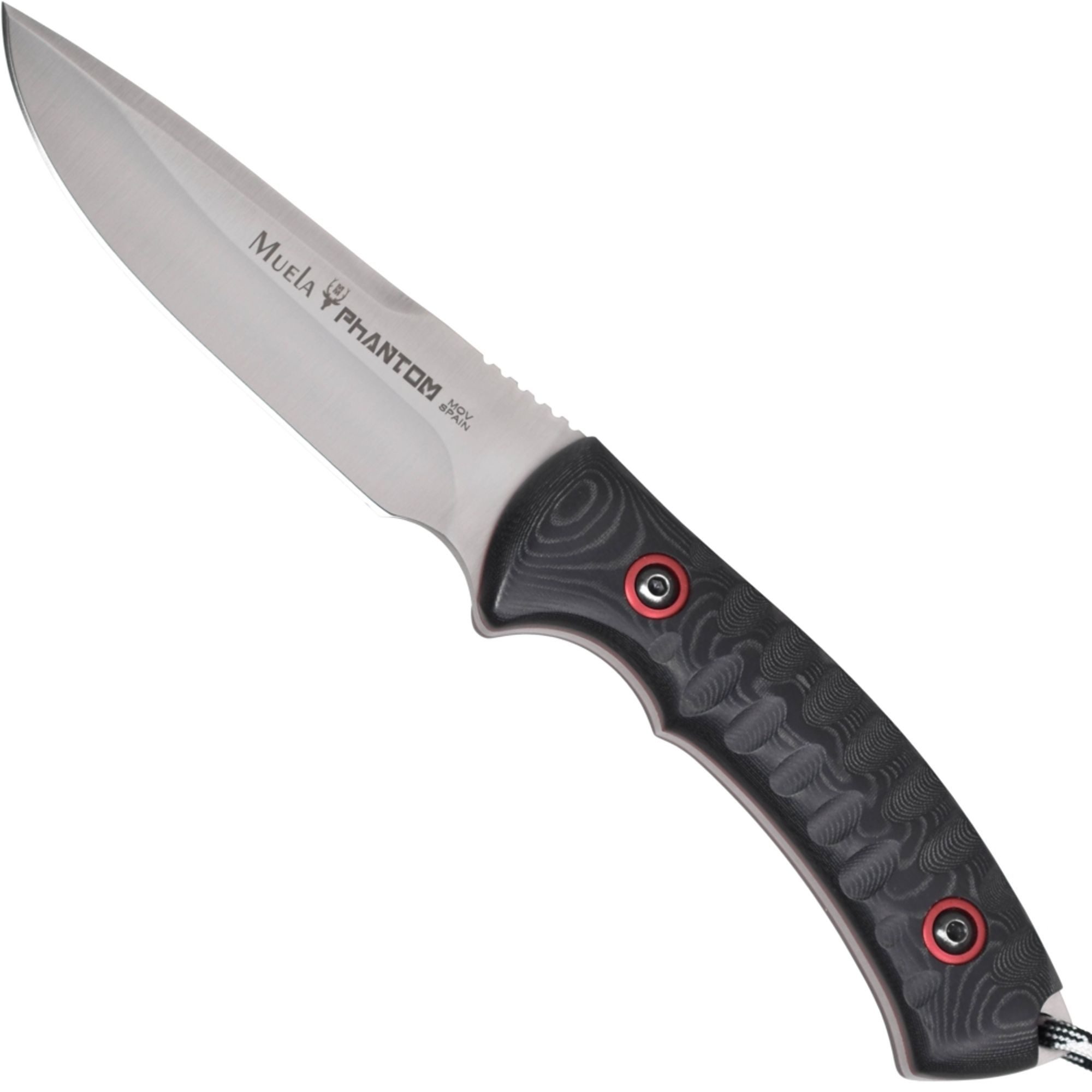 Ein taktisches und elegantes Messer aus dem Hause Muela. Die Griffbeschalung aus schwarzem Micarta hat eine griffige, strukturierte Oberfläche. Zwischen Griffbeschalung und Flachangelklinge ist eine rote Ziereinlage und am Griffende ein praktischer Fangriemen angebracht. Mit hochwertiger Lederscheide.