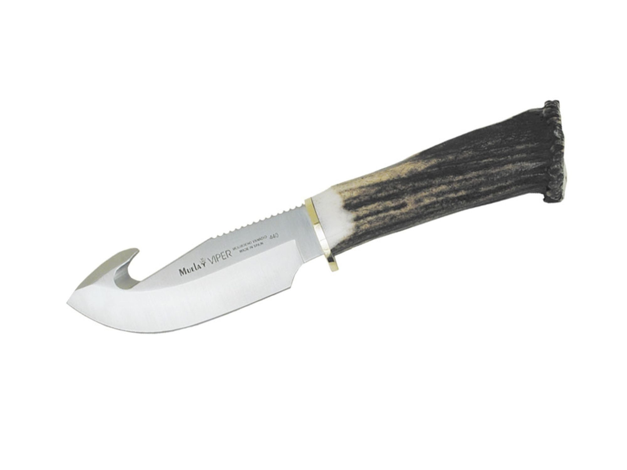 Dieses Jagdmesser vom Muela hat einen Griff aus dem klassischen Naturmaterial Hirschorn mit Rosette am Knauf. Ein Edelstahl-Parierelement schließt den Griff zur Klinge hin ab. Lieferung mit brauner Lederscheide.