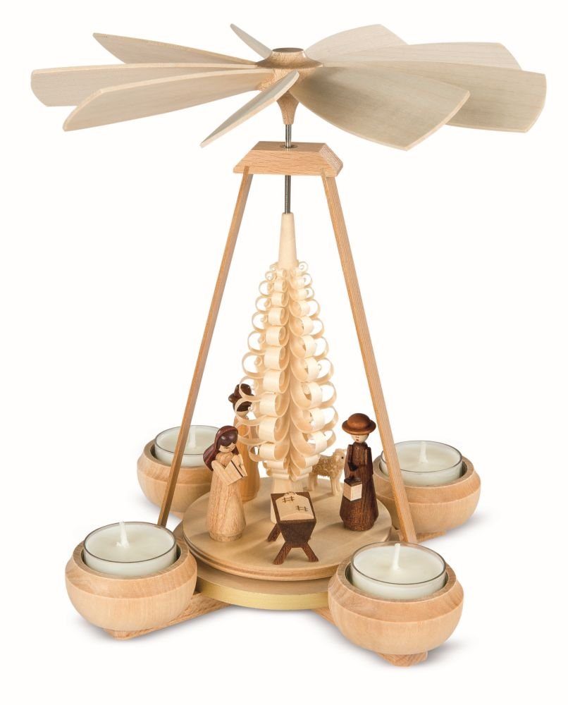 Teelichtpyramide Teelichtpyramide Christi Geburt 1-stöckig natur mit Teelichter Mit dieser schönen Pyramide holen Sie sich ein Stück Erzgebirge in Ihre Wohnung. Sie wird in verschieden Arbeitsschritten komplett in Seiffen in einer Firma mit langer Tradition gefertigt. Der Teller der Pyramide ist mit der Christi Geburt Maria, Josef dem Baby und einem Schäfer mit Schaf bestückt. In der Mitte besitzt die Pyramide einen Spanbaum. Vier Holztüllen mit Glaseinsätzen für normale Teelichter sind den Ecken der Pyramide angebracht, sie beleuchten und treiben die Pyramide an. Die Figuren und das Gestell der Pyramide sind aus verschiedenen Edelhölzern gefertigt und im Naturton gehalten. (LxBxH):17x16x24cm NEU |