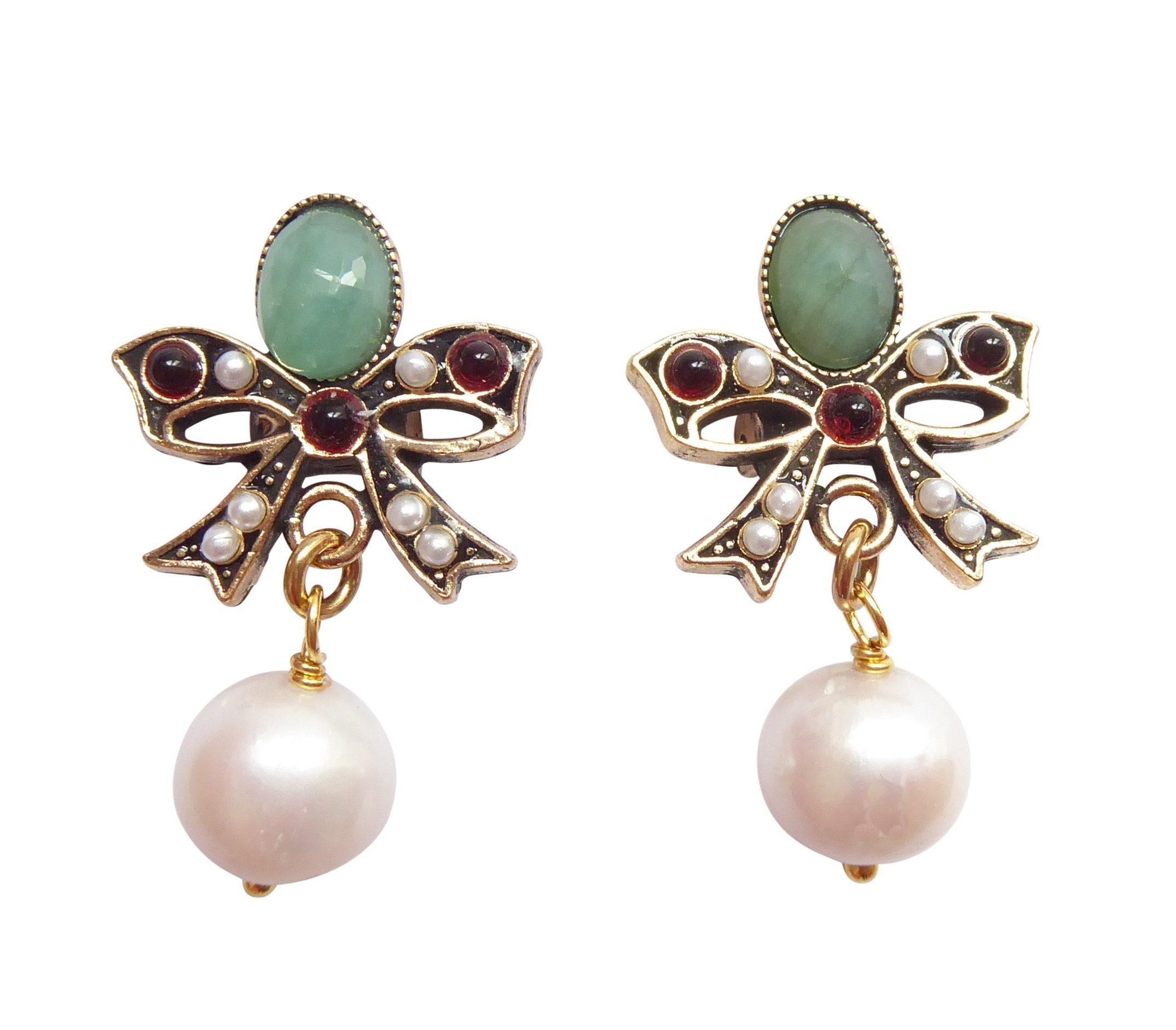 Verspielte Clips mit einem grünen Smaragdstein, kleinen roten Granat-Steinen und Süßwasserperlen. Der Anhänger mit einer großen Süßwasserperle verleiht den Ohrringen einen anmutigen Eindruck. Die stilvollen Clips sind Messing vergoldet. Die Romantikerinnen unter den Frauen werden diese nostalgischen Ohrringe in Schleifenform lieben. Diese edlen, eleganten Ohrringe werden in Florenz in der Werkstatt des berühmten italienischen Designers Giampiero Alcozer in liebevoller Handarbeit gefertigt. Sie sind inspiriert durch historischen Schmuck der Renaissance und des Barock. Durch ihr außergewöhnliches Design sind sie ideal für Feste und Hochzeiten - aber auch ein stilvoller Begleiter für jeden Tag. Maße der Ohrringe: Höhe: 3,2 cm, Breite: 2,0 cm.
