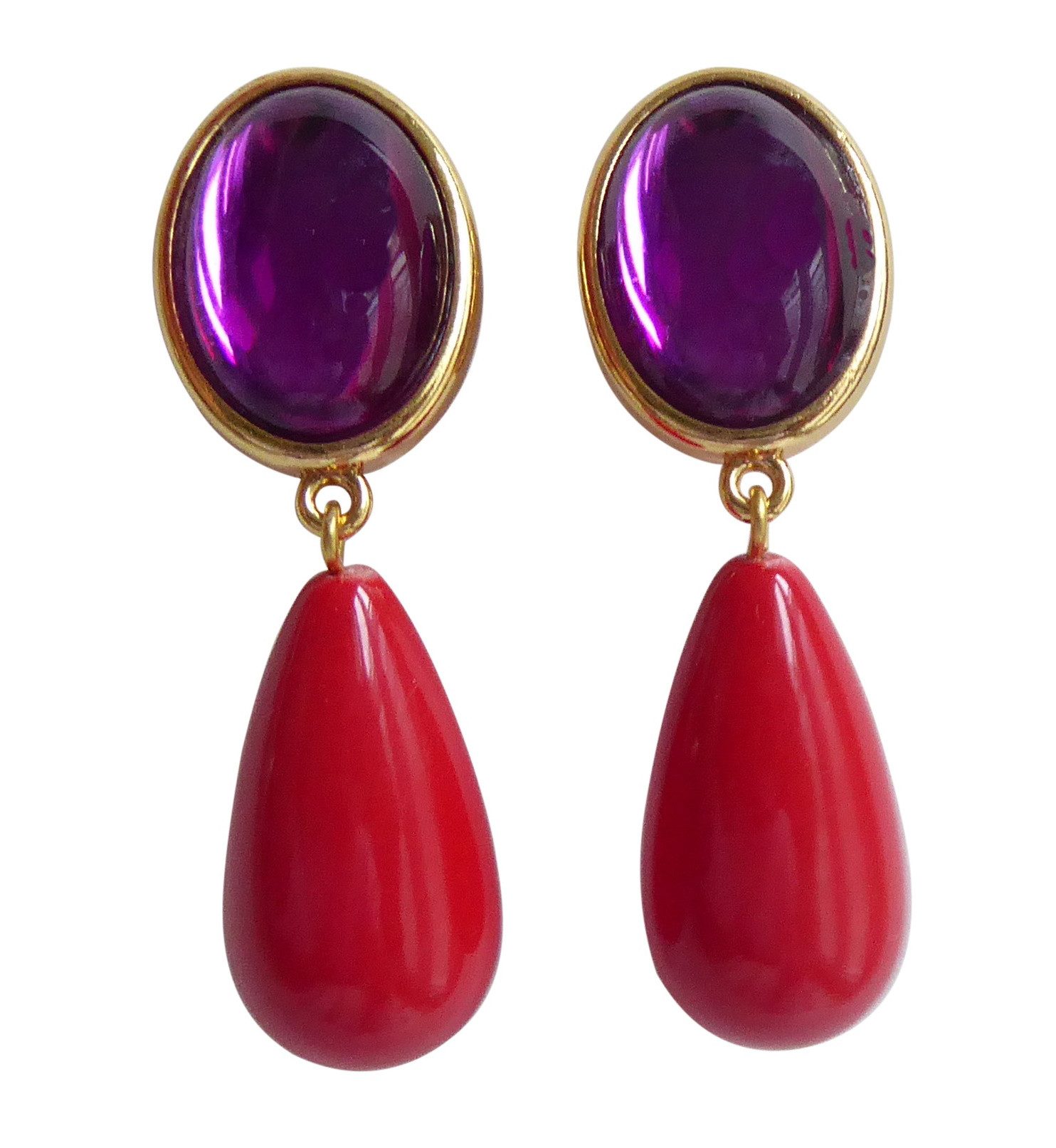 Opulente Ohr-Clips von JustWin mit einem ovalen Stein in einem schönen klaren Amethist-Ton und mit einem tropfenförmigen roten Anhänger. Der Stein und der Anhänger bestehen aus Acryl, so dass die Clips extrem leicht sind. Bei dem Material der Ohrringe handelt es sich um eine antiallergene Metalllegierung mit einer Gelbvergoldung. Diese großen Ohrclips sind ein absoluter Hingucker! Hinter dem Label „JustWin“ stehen die beiden Designer Kurt Justmann und Paul Winter, die Schmuck für Frauen entwerfen, die voluminöse Designs lieben. Die extravaganten, handgearbeiteten Kreationen spielen mit auffälligen Farben, Formen und Oberflächen. Der hochwertige Modeschmuck ist bereits auf der Titelseite der deutschen VOGUE zu bewundern gewesen und erscheint regelmäßig in der Presse. Liebhaberinnen von Statement-Stücken werden bei JustWin nicht widerstehen können! Maße der Ohrringe: Höhe: 5,0 cm, Breite: 1,5 cm.