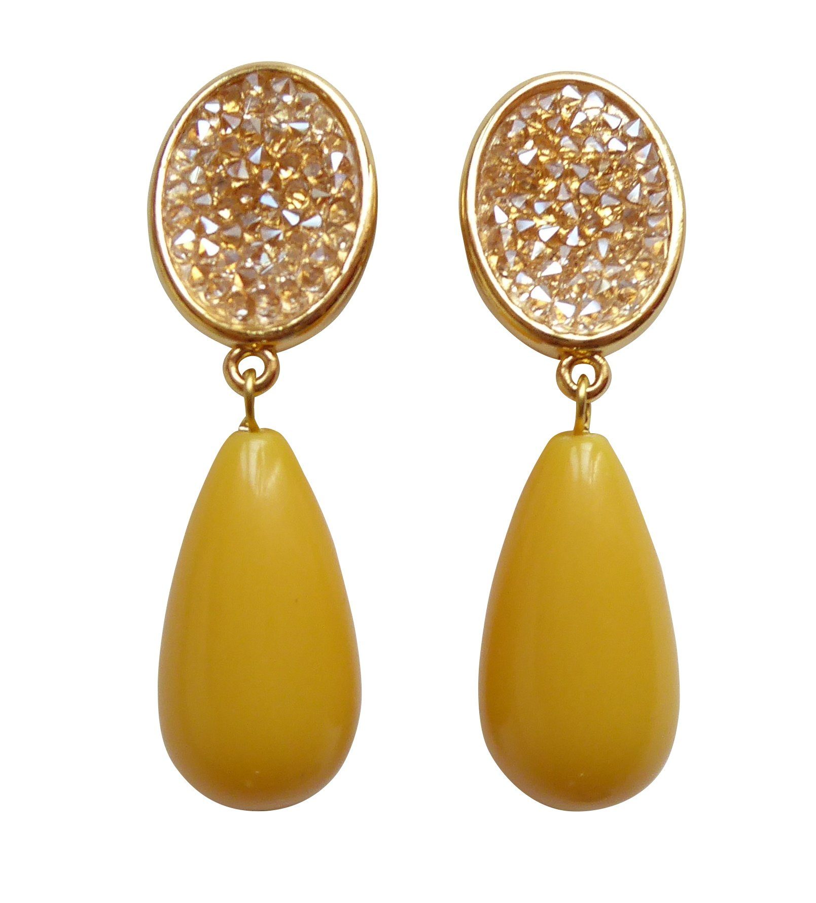 Glamour pur: Glitzernde Ohrclips von JustWin, die mit funkelnden gold-farbenen Steinchen besetzt sind und einen tropfenförmigen Anhänger in einem schönen Gelb-Ton haben. Die kleinen Steinchen und der Anhänger bestehen aus Acryl, so dass die Clips extrem leicht sind. Bei dem Material der Ohrringe handelt es sich um eine antiallergische Metalllegierung mit einer Gelbvergoldung. Diese großen Ohrclips sind ein absoluter Hingucker! Hinter dem Label „JustWin“ stehen die beiden Designer Kurt Justmann und Paul Winter, die Schmuck für Frauen entwerfen, die voluminöse Designs lieben. Die extravaganten, handgearbeiteten Kreationen spielen mit auffälligen Farben, Formen und Oberflächen. Der hochwertige Modeschmuck ist bereits auf der Titelseite der deutschen VOGUE zu bewundern gewesen und erscheint regelmäßig in der Presse. Liebhaberinnen von Statement-Stücken werden bei JustWin nicht widerstehen können! Maße der Ohrringe: Höhe: 5,0 cm, Breite: 1,6 cm.