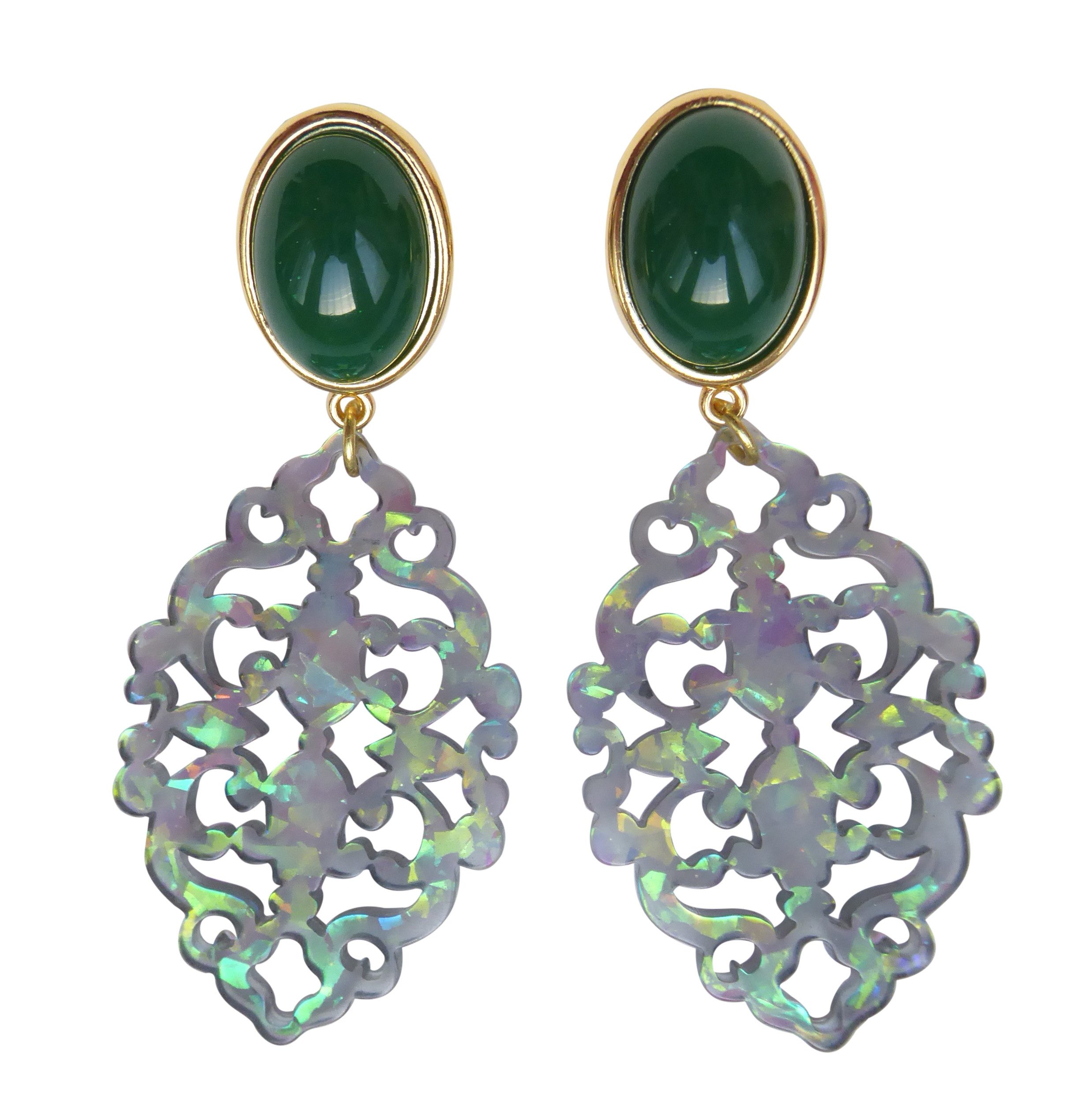 Leuchtende, opulente Ohr-Clips von JustWin mit einem ovalen Stein in einem kräftigen Smaragdgrün und einem verspielt geschnitzten Anhänger, der je nach Lichteinfall phosphorisierend in verschiedenen Farben (grün, lila, gelb und beige) glänzt. Der Stein und der Anhänger bestehen aus Acryl, so dass die Ohrringe extrem leicht sind. Bei dem Material der Ohrringe handelt es sich um eine antiallergische Metalllegierung mit einer Gelbvergoldung. Durch ihre Размер wirken die Clips besonders eindrucksvoll. Farbe und Form erinnern an spanische Flamenco-Tänzerinnen! Hinter dem Label „JustWin“ stehen die beiden Designer Kurt Justmann und Paul Winter, die Schmuck für Frauen entwerfen, die voluminöse Designs lieben. Die extravaganten, handgearbeiteten Kreationen spielen mit auffälligen Farben, Formen und Oberflächen. Der hochwertige Modeschmuck ist bereits auf der Titelseite der deutschen VOGUE zu bewundern gewesen und erscheint regelmäßig in der Presse. Liebhaberinnen von Statement-Stücken werden bei JustWin nicht widerstehen können! Maße der Ohrringe: Höhe: 7,5 cm, Breite Anhänger: 3,2 cm.