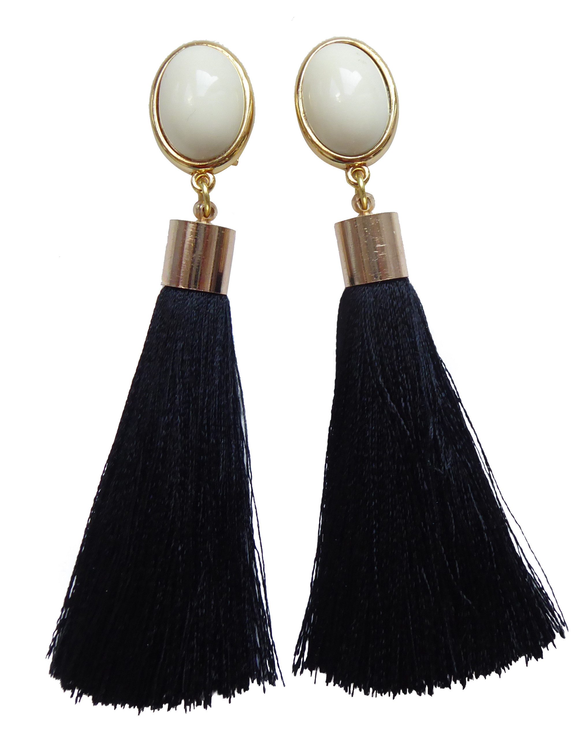 Auffällige Ohrclips von JustWin mit einem ovalen Stein in einem schönen Elfenbein-Ton und mit einem langen, schwarzen Quastenanhänger. Der Stein besteht aus Acryl, so dass die Ohrringe extrem leicht und angenehm zu tragen sind. Bei dem Material der schönen Clips handelt es sich um eine Metalllegierung mit einer Gelbvergoldung. Das Material ist antiallergen und sehr gut verträglich. Diese stylischen, hübschen Ohrringe sind ein absoluter Hingucker! Hinter dem Label „JustWin“ stehen die beiden Designer Kurt Justmann und Paul Winter, die modischen, glamourösen Statement-Schmuck für Frauen entwerfen, die voluminöse und bunte Designs lieben. Die extravaganten, handgearbeiteten Kreationen sind ein eleganter Blickfang und spielen mit auffälligen, fröhlichen Farben, Formen und Oberflächen. Der hochwertige, stilvolle Modeschmuck ist bereits auf der Titelseite der deutschen VOGUE zu bewundern gewesen und erscheint regelmäßig in der Presse. Liebhaberinnen von Statement-Ohrringen in vielen verschiedenen Trend-Farben werden bei JustWin nicht widerstehen können! Moderner, edler und individueller Mode-Stil für jedes Outfit. Die schicken und gleichzeitig auch klassischen Designer-Ohrringe werten jeden Look auf, egal bei welcher Gelegenheit: ob im Büro, in der Freizeit, im Urlaub oder bei einem festlichen Anlass wie einer Feier, Party, Ball, Hochzeit, Konfirmation, Oktoberfest etc. Sie werden gerne zusammen mit einem Dirndl als ausgefallenes Trachten-Schmuckstück getragen. Dieser tolle Bestseller ist auch ein wunderbares Geschenk zum Geburtstag, Weihnachten, Hochzeitstag, Valentinstag oder dergleichen und ein besonderes Must-Have für Frauen und Mädchen. Maße der Ohrringe: Höhe: 9,0 cm, Breite: 1,5 cm.