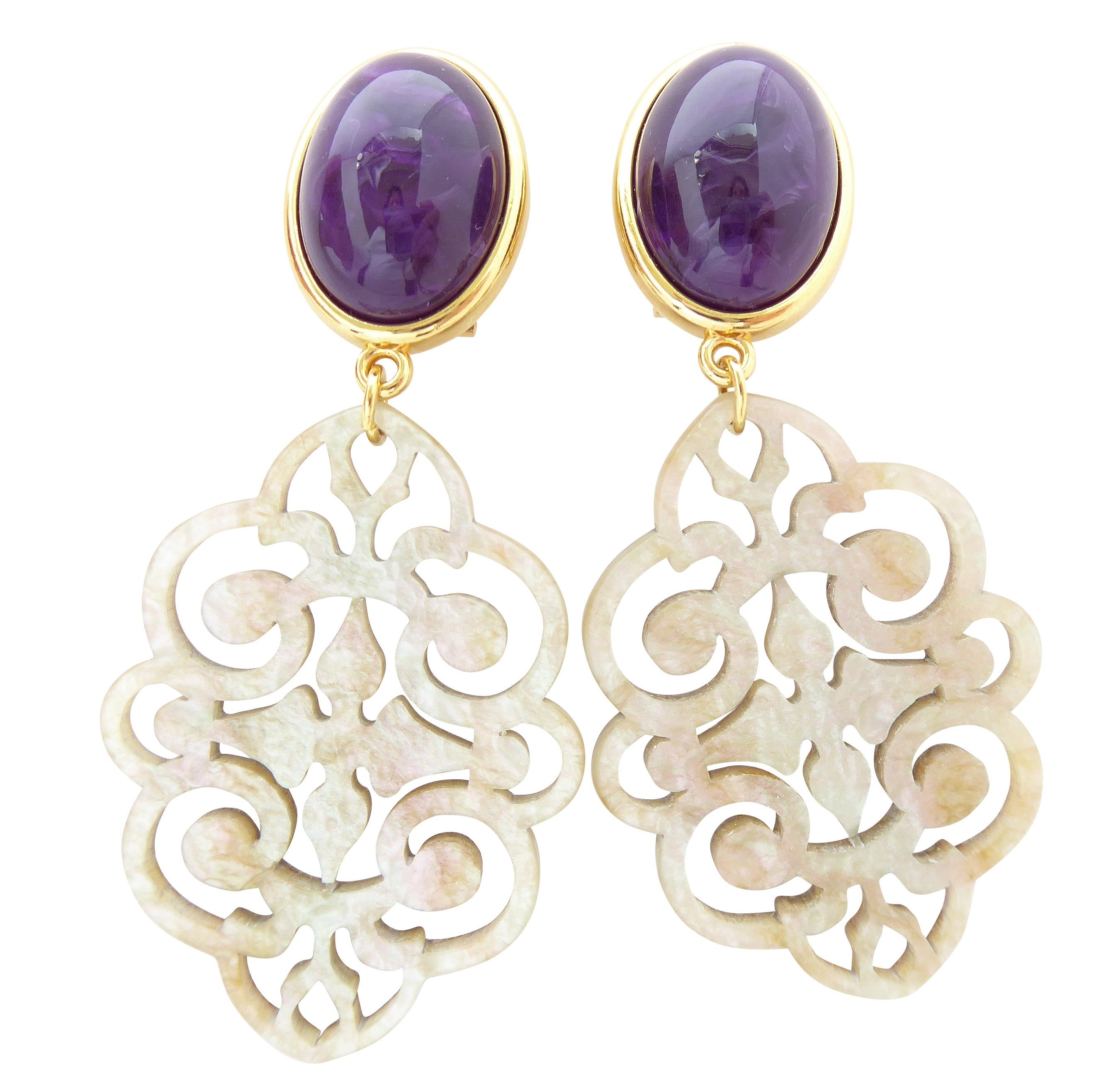 Schön gearbeitete, opulente Ohrclips von JustWin mit einem auberginefarbenen ovalen Stein und einem großen, verspielt geschnitzten Anhänger in Beige-Braun-Tönen, der auf der Vorderseite einen Perlmutt-Glanz hat. Der Stein und der Anhänger bestehen aus Acryl, so dass die Ohrringe extrem leicht sind. Bei dem Material der Ohrringe handelt es sich um eine antiallergische Metalllegierung mit einer Gelbvergoldung. Durch ihre Размер wirken die Clips besonders eindrucksvoll. Passende Ohrringe auch für Liebhaberinnen von Hornschmuck. Hinter dem Label „JustWin“ stehen die beiden Designer Kurt Justmann und Paul Winter, die Schmuck für Frauen entwerfen, die voluminöse Designs lieben. Die extravaganten, handgearbeiteten Kreationen spielen mit auffälligen Farben, Formen und Oberflächen. Der ins Auge fallende Modeschmuck ist bereits auf der Titelseite der deutschen VOGUE zu bewundern gewesen und erscheint regelmäßig in der Presse. Liebhaberinnen von Statement-Stücken werden bei JustWin nicht widerstehen können! Maße der Ohrringe: Höhe: 6,7 cm, Breite: 3,1 cm.