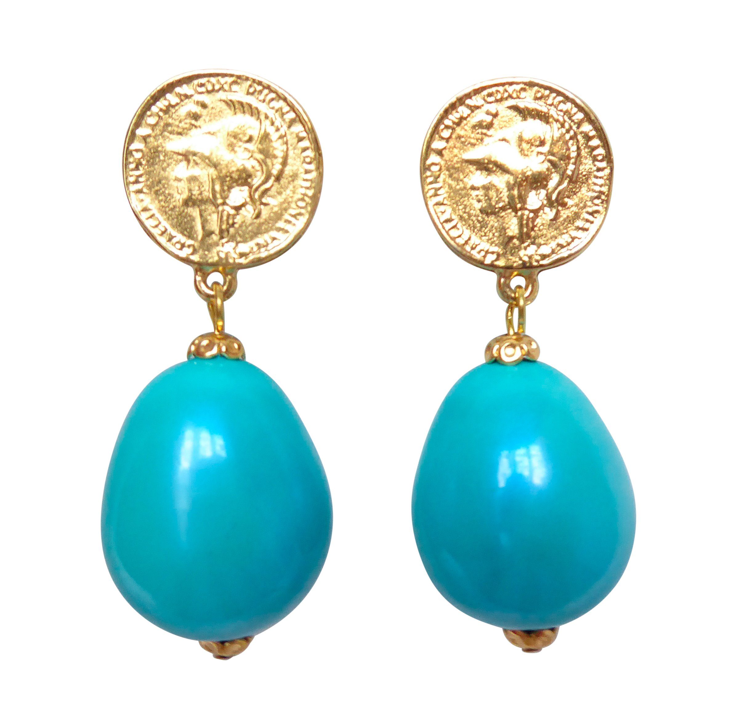 Mal etwas ganz anderes: große vergoldete Ohr-Clips von JustWin in Form einer römischen Münze. Der tropfenförmige türkise Anhänger bildet einen schönen Kontrast zu der Münze. Der Anhänger besteht aus Acryl, so dass die Clips schön leicht sind. Bei dem Material der Ohrclips handelt es sich um eine antiallergische Metalllegierung mit einer Gelbvergoldung. Das ausgefallene Design dieses Schmuckstücks verleiht Ihnen ein besonderes Flair! Hinter dem Label „JustWin“ stehen die beiden Designer Kurt Justmann und Paul Winter, die Schmuck für Frauen entwerfen, die voluminöse Designs lieben. Die extravaganten, handgearbeiteten Kreationen spielen mit auffälligen Farben, Formen und Oberflächen. Der hochwertige Modeschmuck ist bereits auf der Titelseite der deutschen VOGUE zu bewundern gewesen und erscheint regelmäßig in der Presse. Liebhaberinnen von Statement-Stücken werden bei JustWin nicht widerstehen können! Maße der Ohrringe: Höhe: 4,8 cm, Breite: 2,0 cm.